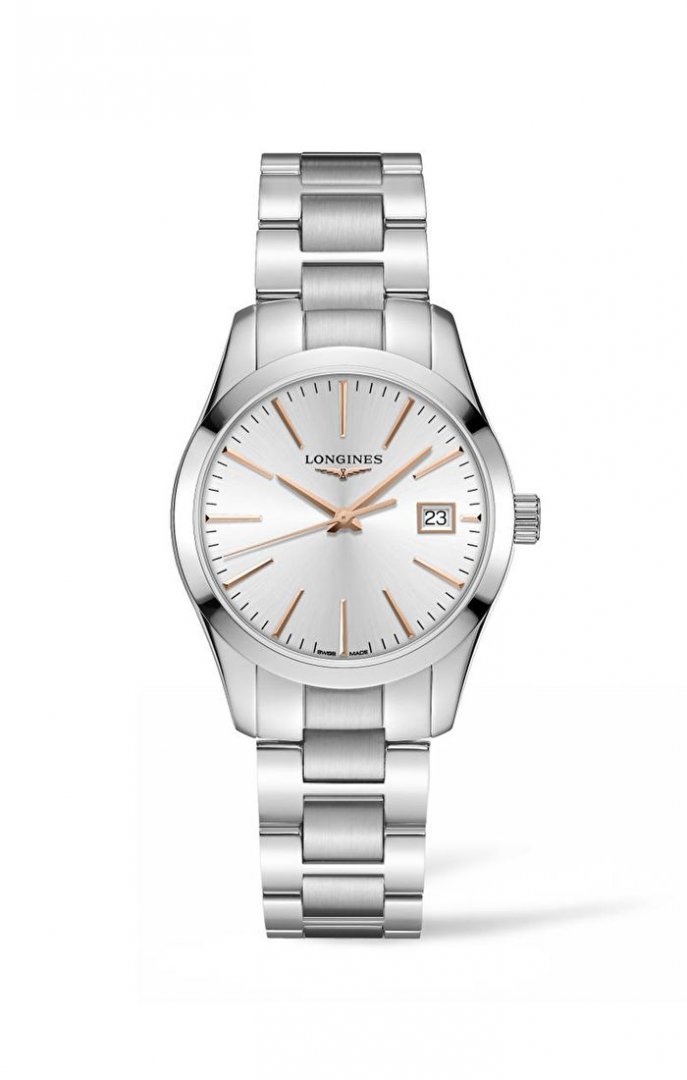Luxusné hodinky Longines Conquest Classic Quartz, 34 mm. Hodinky disponujú funkciami luminiscencia, ukazovateľ dátumu a E.O.L.. Základné parametre hodín sú: typ strojčeka je Quartz hodinky, materiál remienka je oceľ, vode odolnosť je 50 m a farba ciferníka je strieborná.