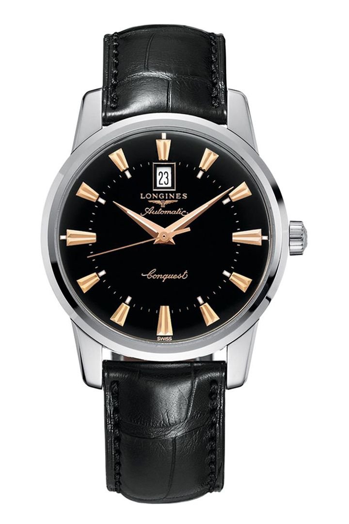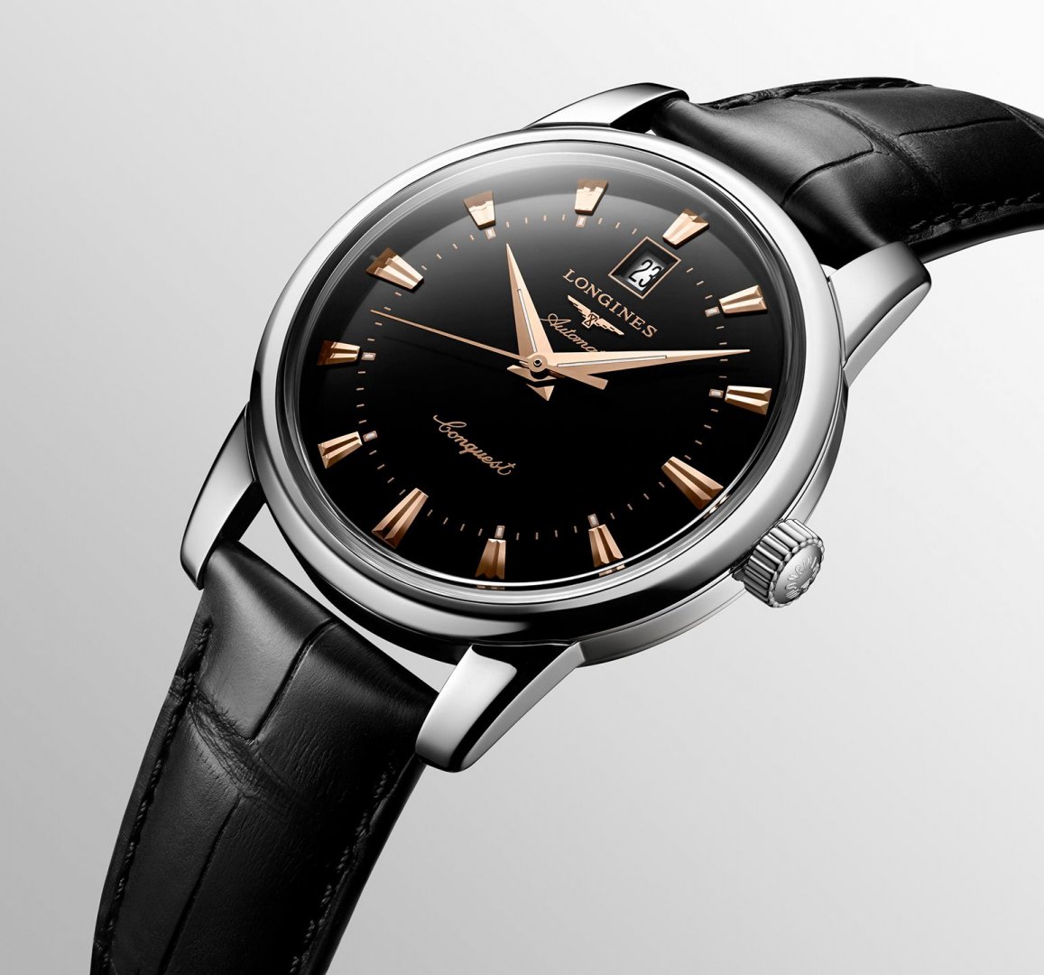 luxusné hodinky Longines Conquest Heritage Automat, 40 mm. Hodinky disponujú funkciami luminiscencia a ukazovateľ dátumu. Základné parametre hodín sú: farba ciferníka je čierna, typ strojčeka je mechanické hodinky s automatickým náťahom, materiál remienka je koža a vode odolnosť je 30 m.