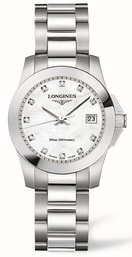 Luxusné hodinky Longines Conquest Diamanty, Quartz, Vode odolnosť 300M, 29.50 mm. Hodinky disponujú funkciami luminiscencia, ukazovateľ dátumu a E.O.L.. Základné parametre hodín sú: farba ciferníka je perleť, typ strojčeka je Quartz hodinky, materiál remienka je oceľ a vode odolnosť je 300 m.