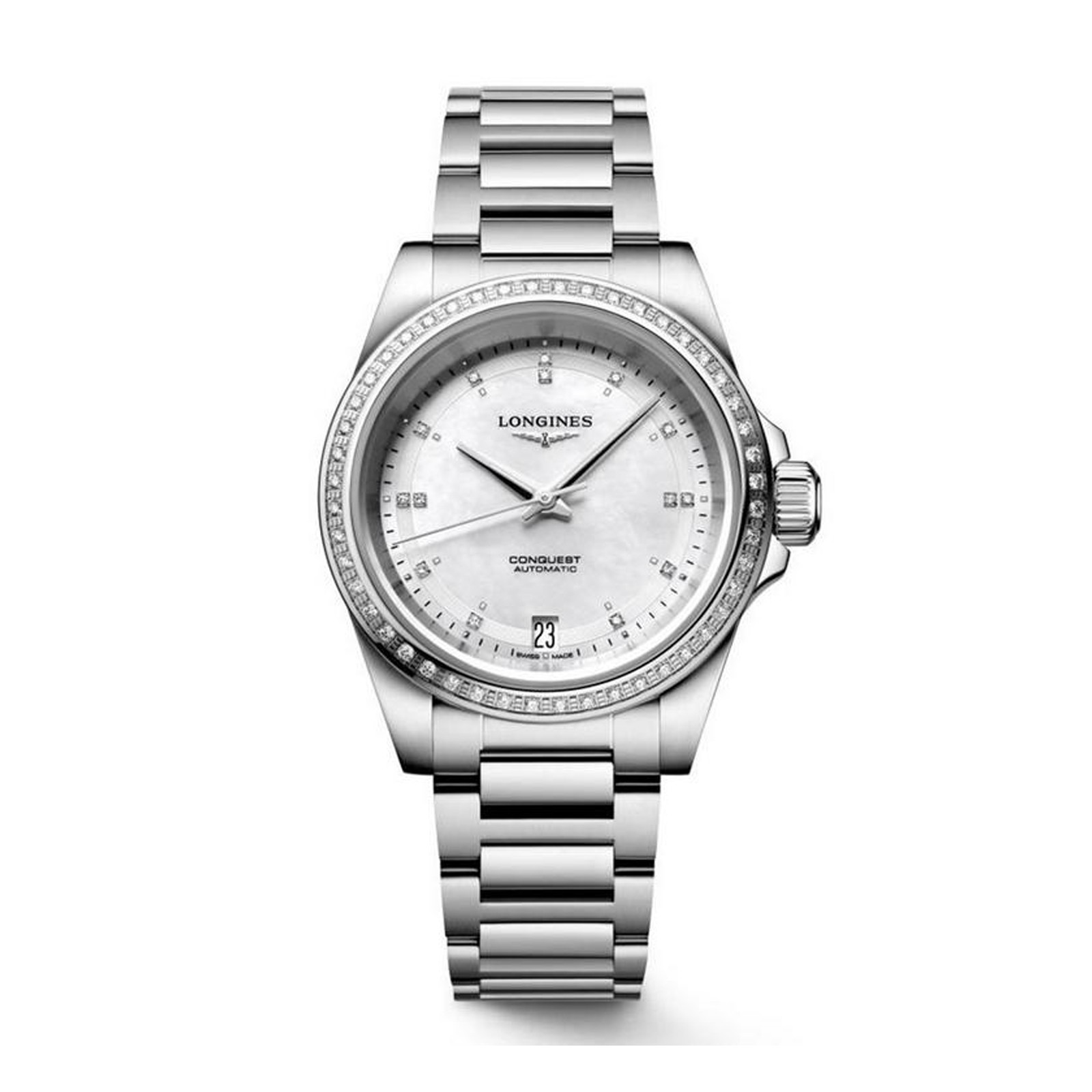 luxusné hodinky Longines Conquest Diamanty, Automat, 34 mm. Hodinky disponujú funkciami ukazovateľ dátumu. Základné parametre hodín sú: farba ciferníka je perleť, typ strojčeka je mechanické hodinky s automatickým náťahom, materiál remienka je oceľ a vode odolnosť je 100 m.