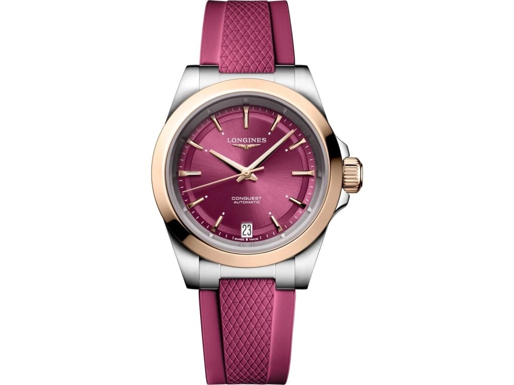luxusné hodinky Longines Conquest Zlato, Automat, 34 mm. Hodinky disponujú funkciami ukazovateľ dátumu. Základné parametre hodín sú: typ strojčeka je mechanické hodinky s automatickým náťahom, vode odolnosť je 100 m, materiál remienka je pryž a farba ciferníka je ružová.