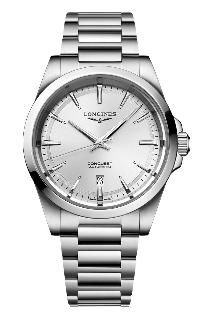 luxusné hodinky Longines Conquest Automat, 41 mm. Hodinky disponujú funkciami ukazovateľ dátumu. Základné parametre hodín sú: typ strojčeka je mechanické hodinky s automatickým náťahom, materiál remienka je oceľ, vode odolnosť je 100 m a farba ciferníka je strieborná.