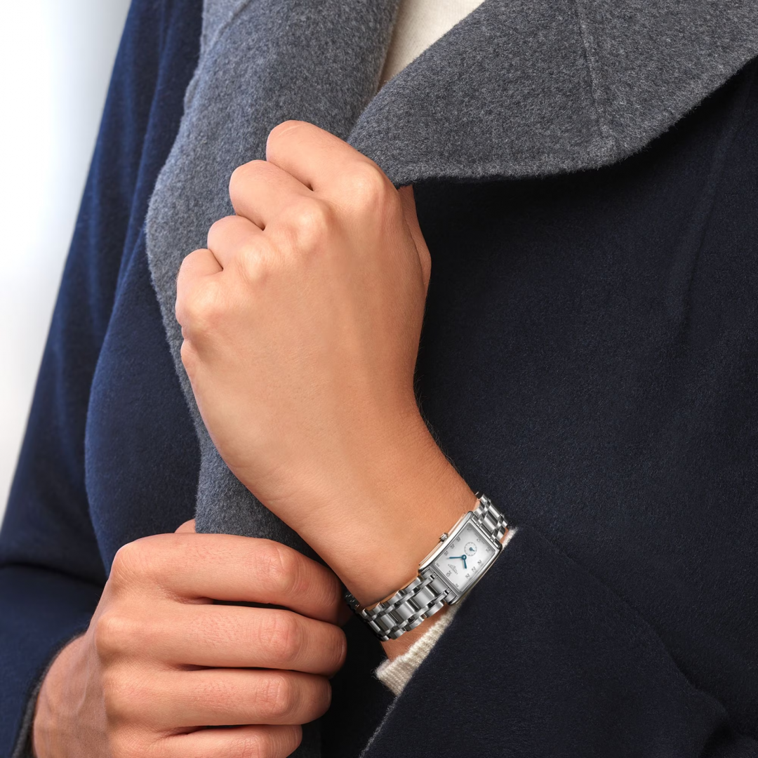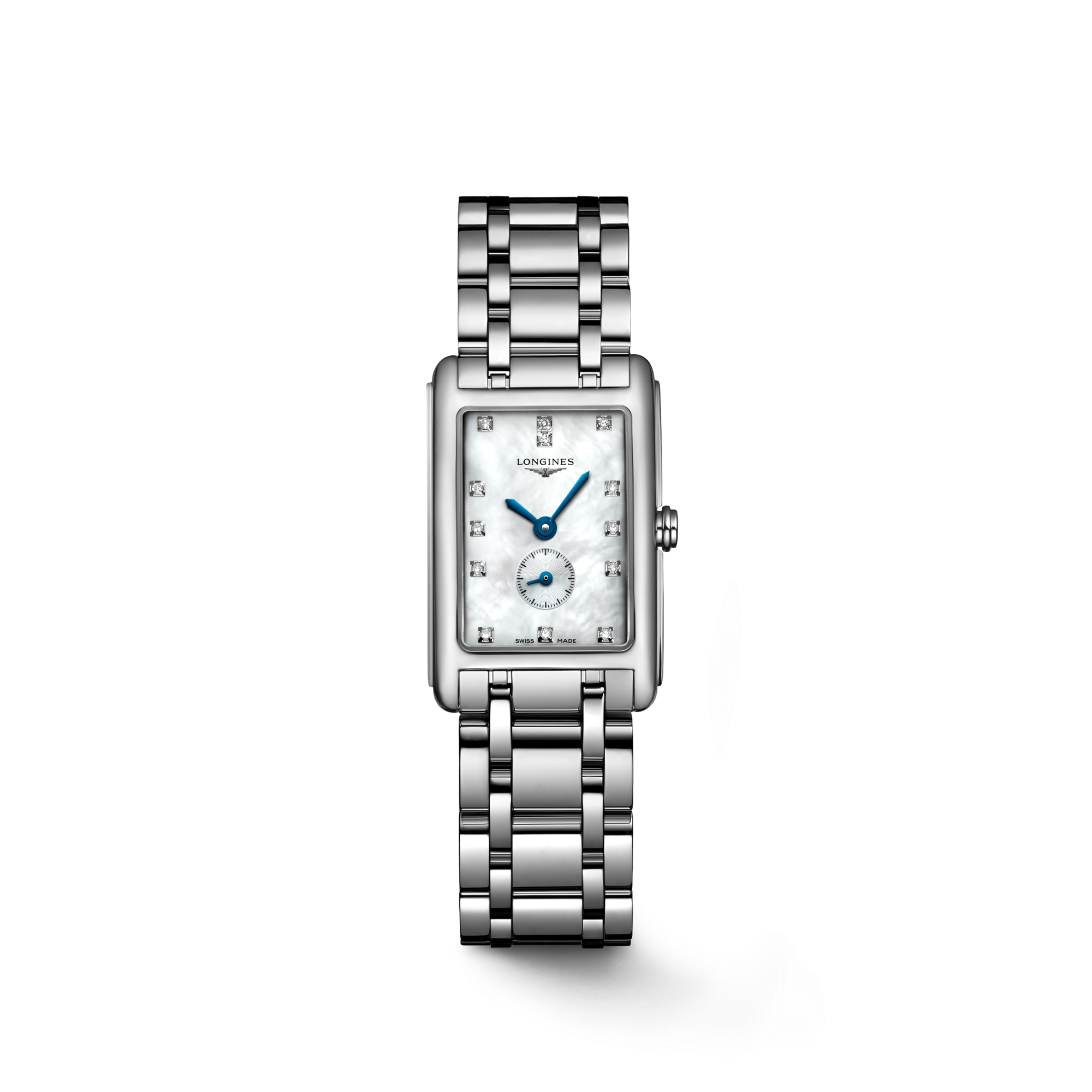 luxusné hodinky Longines DolceVitta Diamanty, Quartz, 20.8 x 32 mm. Hodinky disponujú funkciami E.O.L.. Základné parametre hodín sú: typ strojčeka je Quartz hodinky, materiál remienka je oceľ, vode odolnosť je 30 m a farba ciferníka je perleť.