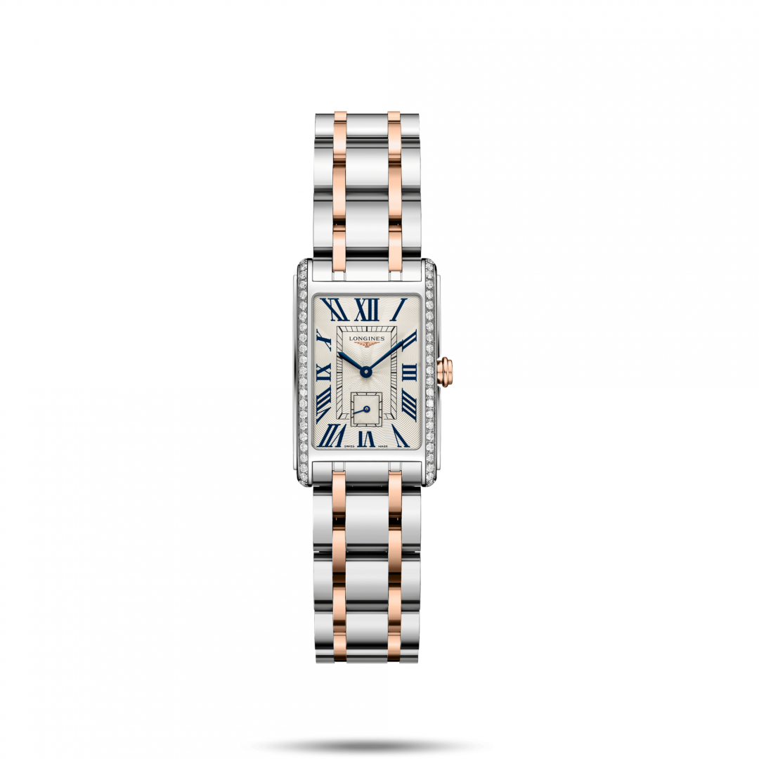 Luxusné hodinky Longines DolceVitta Diamanty, Quartz, 20.80 x 32.00 mm. Hodinky disponujú funkciami E.O.L.. Základné parametre hodín sú: farba ciferníka je strieborná, typ strojčeka je Quartz hodinky, materiál remienka je oceľ a zlato a vode odolnosť je 30 m.
