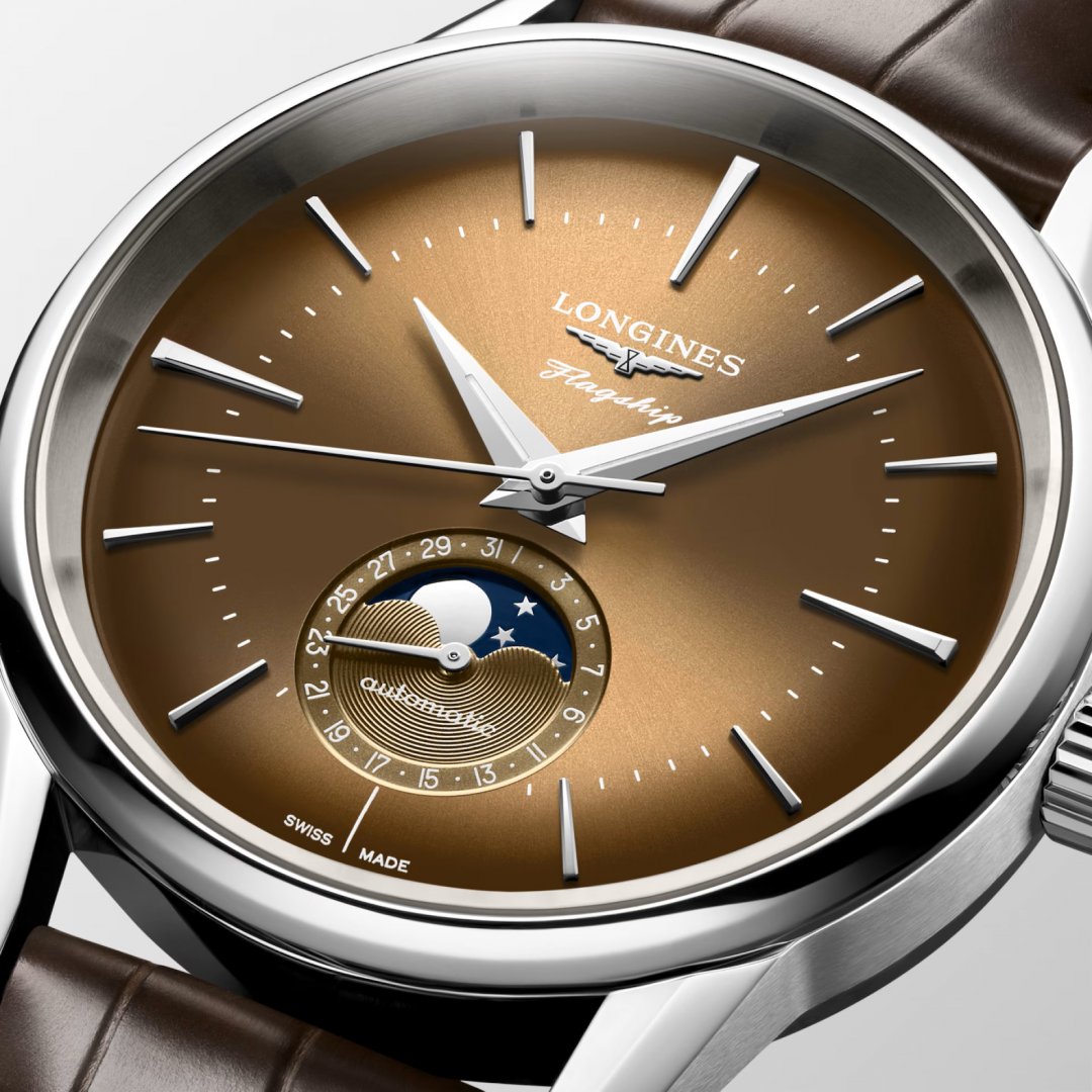 luxusné hodinky Longines Flagship Heritage Automat, Mesačné fázy, 38.50 mm. Hodinky disponujú funkciami mesačné fázy a ukazovateľ dátumu. Základné parametre hodín sú: typ strojčeka je mechanické hodinky s automatickým náťahom, materiál remienka je koža, vode odolnosť je 30 m a farba ciferníka je hnědá.