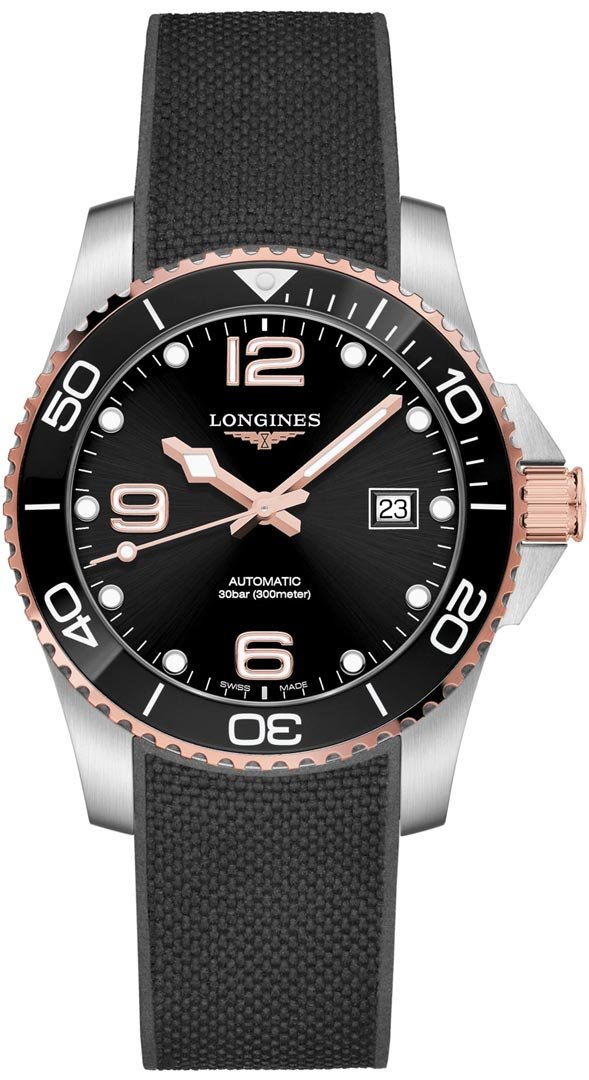 luxusné hodinky Longines HydroConquest Keramická luneta, Automat, 41 mm. Hodinky disponujú funkciami luminiscencia a ukazovateľ dátumu. Základné parametre hodín sú: vode odolnosť je 300 m, typ strojčeka je mechanické hodinky s automatickým náťahom, materiál remienka je kaučuk a farba ciferníka je čierna.