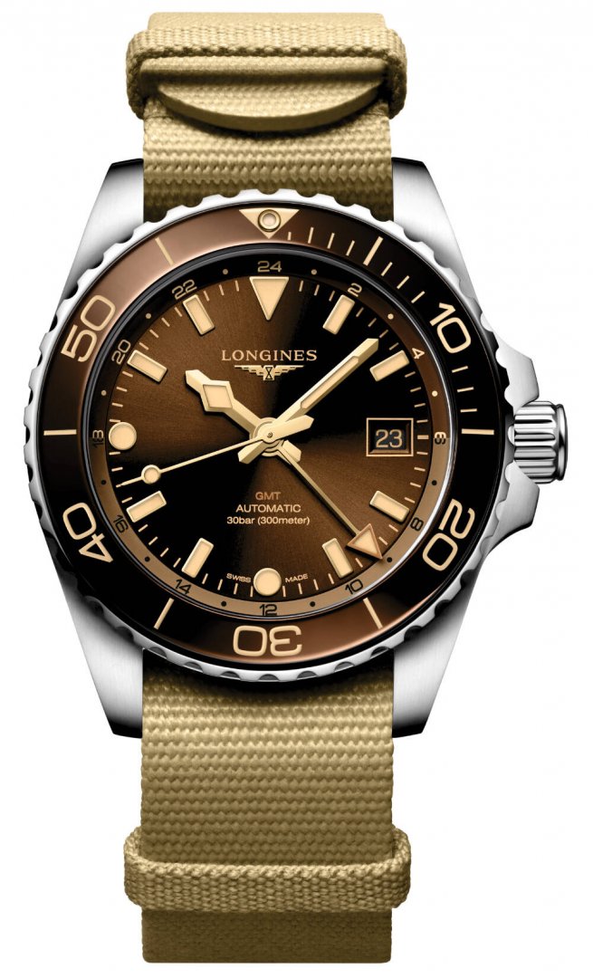 luxusné hodinky Longines HydroConquest GMT Automat, Vode odolnosť 300M, 41 mm. Hodinky disponujú funkciami duálny čas, luminiscencia a ukazovateľ dátumu. Základné parametre hodín sú: typ strojčeka je mechanické hodinky s automatickým náťahom, vode odolnosť je 300 m, farba ciferníka je hnědá a materiál remienka je textil.