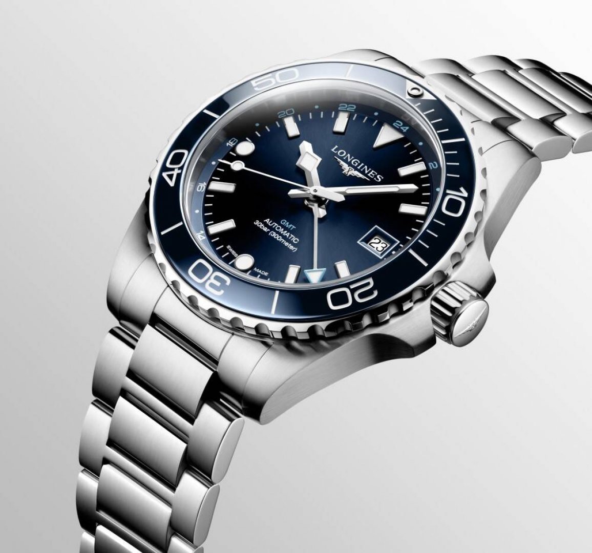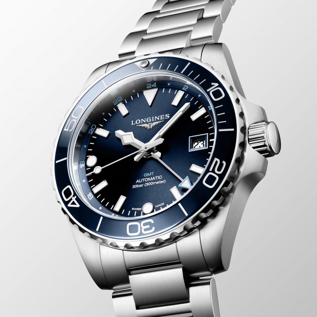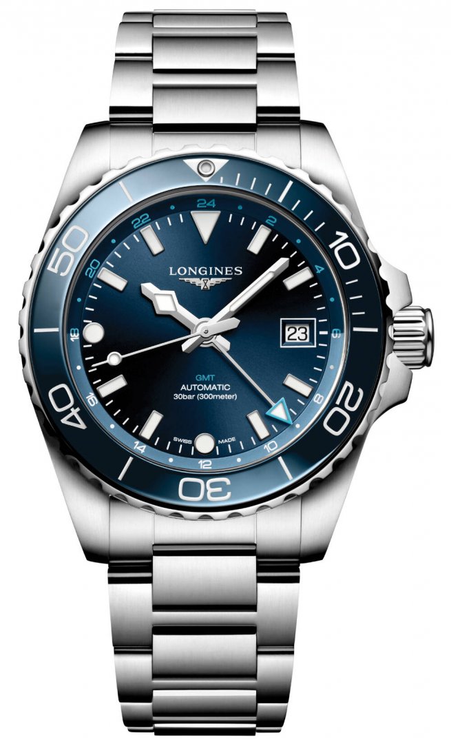 luxusné hodinky Longines HydroConquest GMT Automat, Vode odolnosť 300M, 41 mm. Hodinky disponujú funkciami duálny čas, luminiscencia a ukazovateľ dátumu. Základné parametre hodín sú: typ strojčeka je mechanické hodinky s automatickým náťahom, vode odolnosť je 300 m, materiál remienka je oceľ a farba ciferníka je modrá.