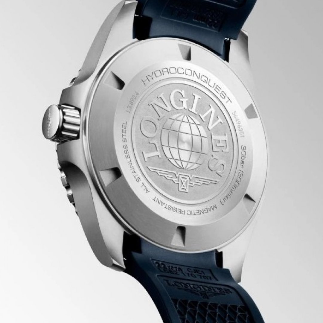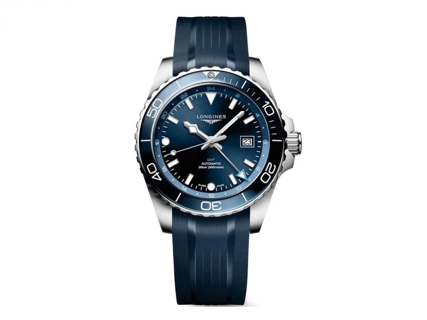 luxusné hodinky Longines HydroConquest GMT Automat, Vode odolnosť 300M, 43 mm. Hodinky disponujú funkciami duálny čas, luminiscencia a ukazovateľ dátumu. Základné parametre hodín sú: typ strojčeka je mechanické hodinky s automatickým náťahom, materiál remienka je kaučuk, vode odolnosť je 300 m a farba ciferníka je modrá.