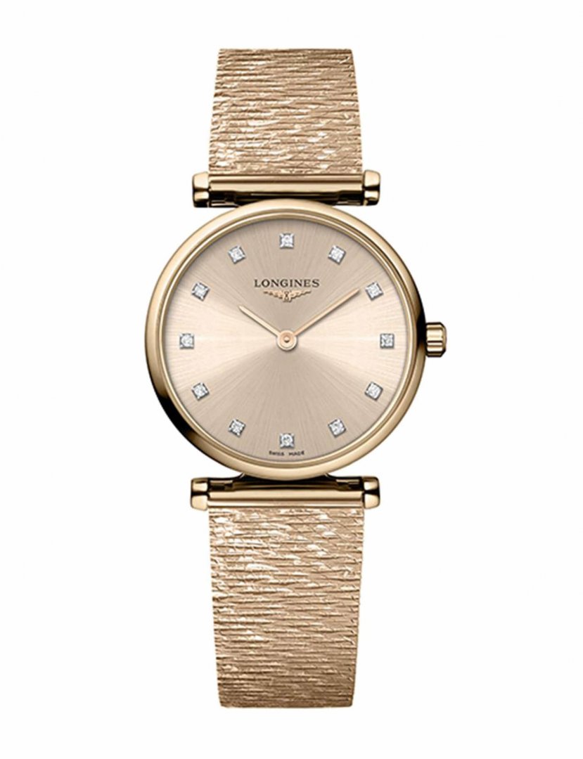 luxusné hodinky Longines La Grande Classique de Longines Diamanty, Quartz, 24 mm. Základné parametre hodín sú: typ strojčeka je Quartz hodinky, materiál remienka je oceľ, vode odolnosť je 30 m a farba ciferníka je zlatá.