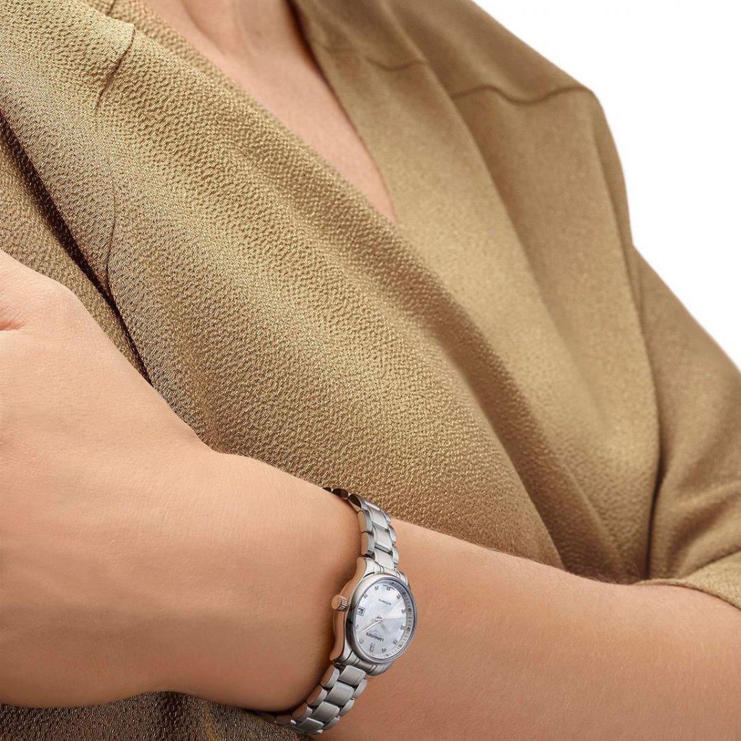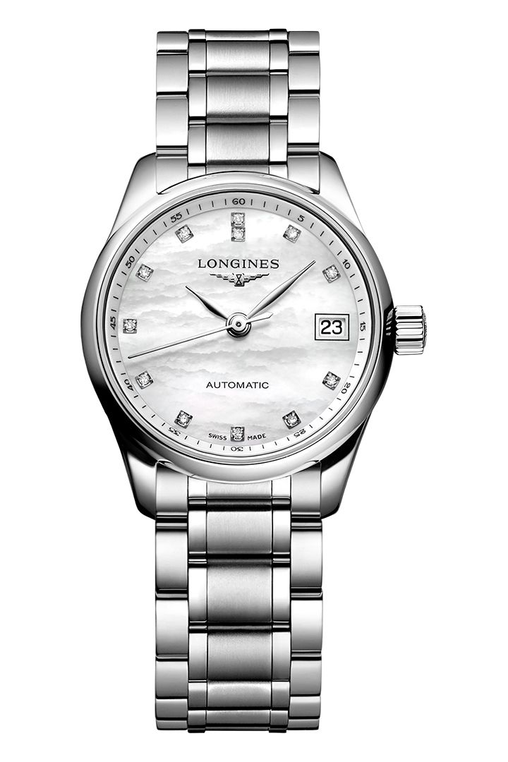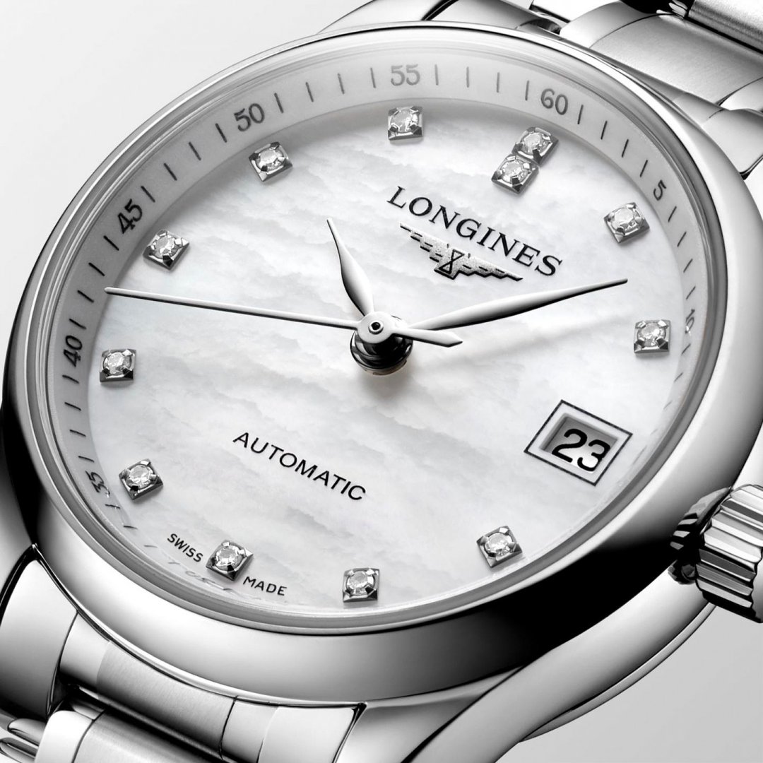 luxusné hodinky Longines Master Collection Diamanty, Automat, 25.5 mm. Hodinky disponujú funkciami ukazovateľ dátumu. Základné parametre hodín sú: typ strojčeka je mechanické hodinky s automatickým náťahom, vode odolnosť je 30 m, materiál remienka je oceľ a farba ciferníka je perleť.