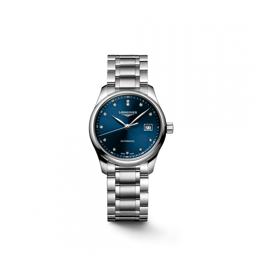 luxusné hodinky Longines Master Collection Diamanty, Automat, 34 mm. Hodinky disponujú funkciami ukazovateľ dátumu. Základné parametre hodín sú: typ strojčeka je mechanické hodinky s automatickým náťahom, vode odolnosť je 30 m, farba ciferníka je modrá a materiál remienka je oceľ.
