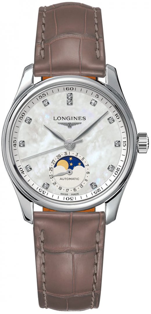 luxusné hodinky Longines Master Collection Diamanty, Automat, 34 mm. Hodinky disponujú funkciami mesačné fázy a ukazovateľ dátumu. Základné parametre hodín sú: farba ciferníka je perleť, typ strojčeka je mechanické hodinky s automatickým náťahom, vode odolnosť je 30 m a materiál remienka je koža.
