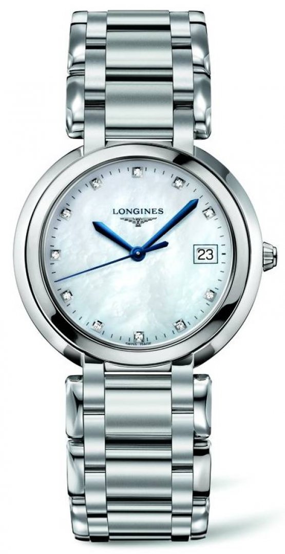 Luxusné hodinky Longines PrimaLuna Quartz, Diamanty, 34 mm. Hodinky disponujú funkciami ukazovateľ dátumu a E.O.L.. Základné parametre hodín sú: farba ciferníka je perleť, typ strojčeka je Quartz hodinky, materiál remienka je oceľ a vode odolnosť je 30 m.