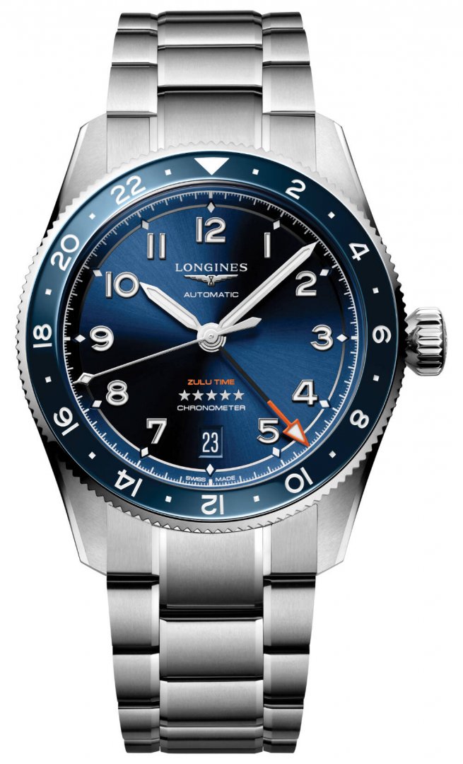 luxusné hodinky Longines Spirit Zulu Time GMT, Automat, Vode odolnosť 100M, 39 mm. Hodinky disponujú funkciami duálny čas, luminiscencia a ukazovateľ dátumu. Základné parametre hodín sú: typ strojčeka je mechanické hodinky s automatickým náťahom, vode odolnosť je 100 m, farba ciferníka je modrá a materiál remienka je oceľ.