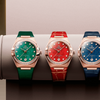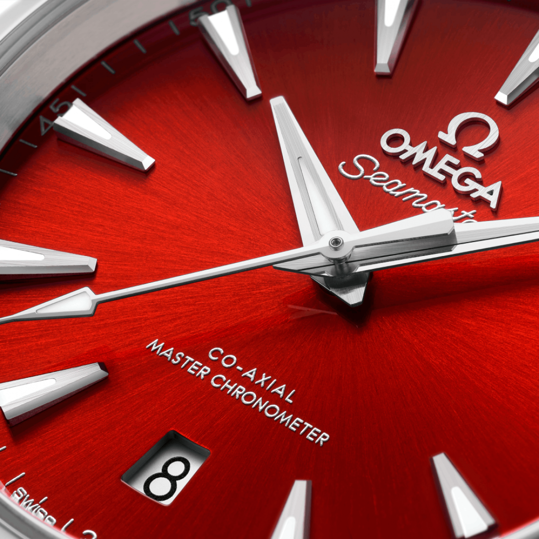 Omega predstavuje dvojičky v 34 a 38-milimetrovom prevedení, v tomto priemere AquaTerra opúšťa koncept "teak" ciferníkov, ktorý mal pripomínať drevenú palubu lode. Značka stavila na farebnú paletu ciferníkov bez Tiffany, môžete ich vidieť na obrázku. Obe velkosti ciferníkov budú zdobené efektom „sunburst“, prípadne lakované. Dátum ostávana pozícii 6 a v tomto väčšom priemere to pôsobí len ako „vyrezaný“ otvor do ciferníka. Neviem, koho Omega mieni týmto modelom osloviť, no nemôžem sa ubrániť pocitu, že pôsobia jemne dámsky. Menší priemer sa od väčšieho bude odlišovať nielen ozdobnejším rámom dátumového venca, ale aj indexmi vyplnenými SuperLuminovou v tvare člna. Indexy sú v oboch prípadoch vyrobené z bieleho zlata a aplikované ručne. O pohon sa postará OMEGA Co-Axial Master Chronometer 8800 s certifikáciou METAS s rezervou chodu 55 hodín – údaj platný pre verziu 34 a 38 mm.