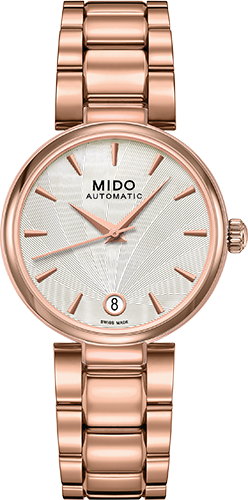 Luxusné hodinky Mido Baroncelli Donna Automat, 33 mm. Hodinky disponujú funkciami ukazovateľ dátumu. Základné parametre hodín sú: typ strojčeka je mechanické hodinky s automatickým náťahom, vode odolnosť je 50 m, farba ciferníka je strieborná a materiál remienka je oceľ.
