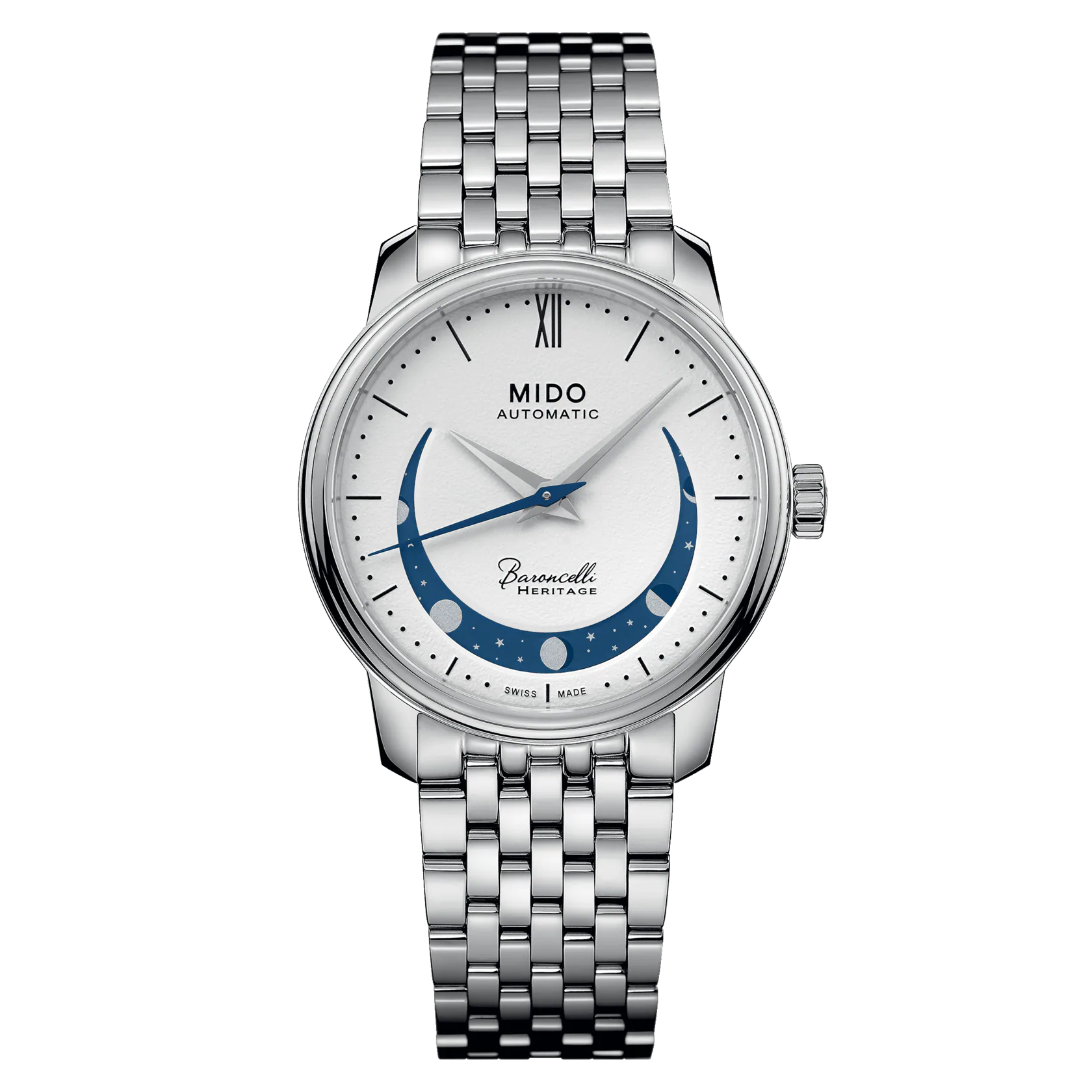 luxusné hodinky Mido Baroncelli SMILING MOON LADY Automat, 33 mm. Hodinky disponujú funkciami ukazovateľ dátumu a mesačné fázy. Základné parametre hodín sú: farba ciferníka je biela, typ strojčeka je mechanické hodinky s automatickým náťahom, vode odolnosť je 30 m a materiál remienka je oceľ.