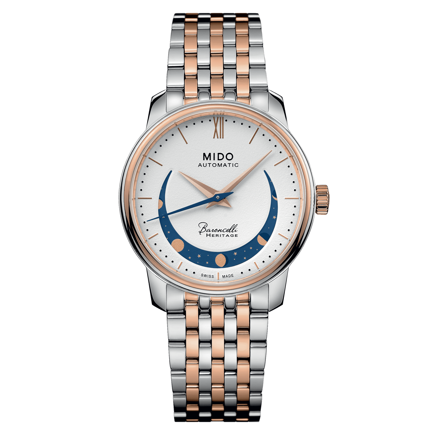 luxusné hodinky Mido Baroncelli SMILING MOON LADY Mesačné fázy, Automat, 33 mm. Hodinky disponujú funkciami mesačné fázy. Základné parametre hodín sú: typ strojčeka je mechanické hodinky s automatickým náťahom, vode odolnosť je 50 m, materiál remienka je oceľ a farba ciferníka je biela.