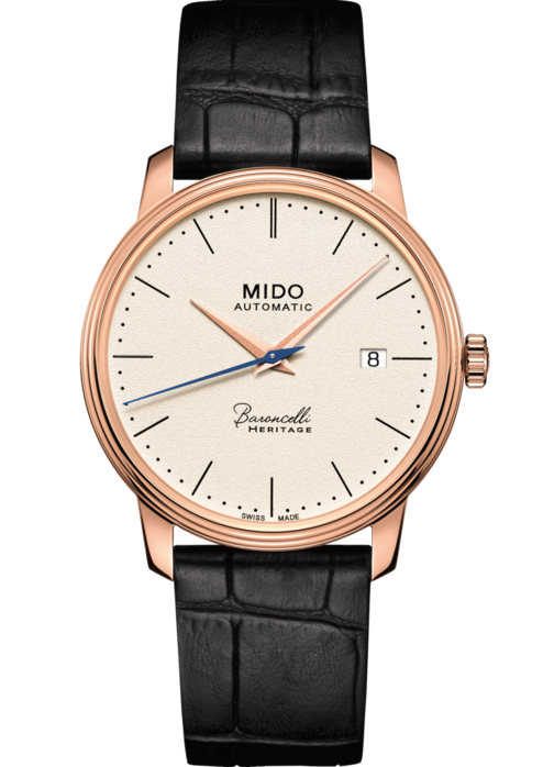 Luxusné hodinky Mido Baroncelli Heritage Automat, 39 mm. Hodinky disponujú funkciami ukazovateľ dátumu. Základné parametre hodín sú: farba ciferníka je béžová, typ strojčeka je mechanické hodinky s automatickým náťahom, materiál remienka je koža a vode odolnosť je 30 m.