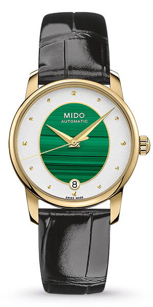 Luxusné hodinky Mido Baroncelli Wild Stone Powermatic 80, 33 mm. Hodinky disponujú funkciami ukazovateľ dátumu. Základné parametre hodín sú: farba ciferníka je biela a modrá, typ strojčeka je mechanické hodinky s automatickým náťahom, materiál remienka je koža a vode odolnosť je 50 m.