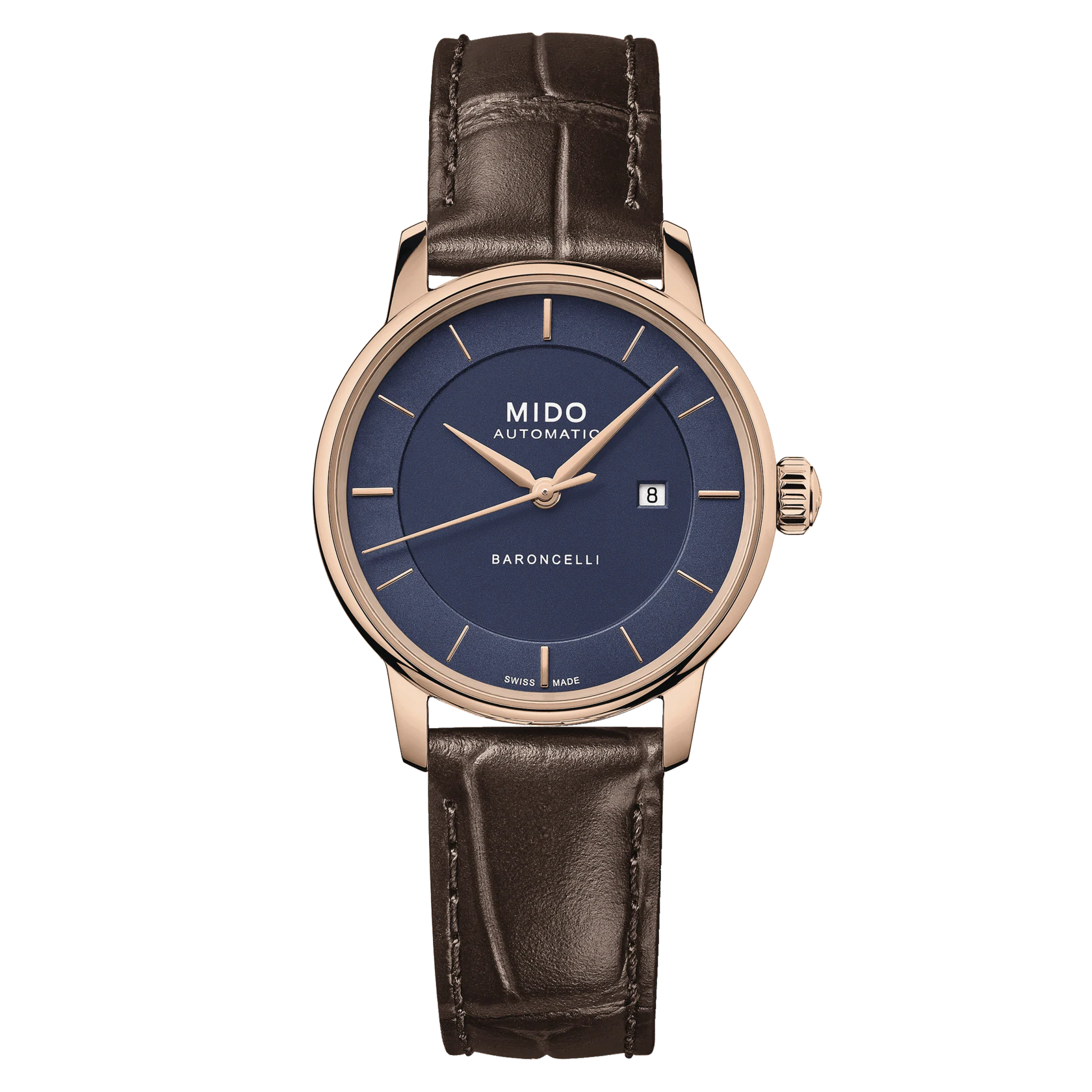 luxusné hodinky Mido Baroncelli Signature Lady Automat, 30 mm. Hodinky disponujú funkciami ukazovateľ dátumu. Základné parametre hodín sú: typ strojčeka je mechanické hodinky s automatickým náťahom, vode odolnosť je 50 m, farba ciferníka je modrá a materiál remienka je koža.
