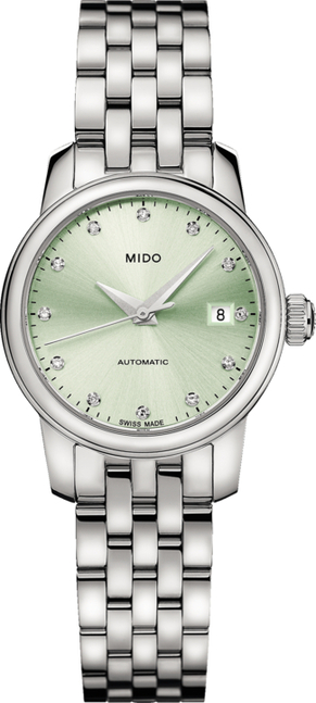 luxusné hodinky Mido Baroncelli Lady Twenty Five Diamanty, Automat, 25 mm. Hodinky disponujú funkciami ukazovateľ dátumu. Základné parametre hodín sú: typ strojčeka je mechanické hodinky s automatickým náťahom, materiál remienka je oceľ, vode odolnosť je 50 m a farba ciferníka je zelená.