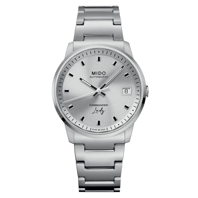 luxusné hodinky Mido Commander Lady Automat, 35 mm. Hodinky disponujú funkciami luminiscencia a ukazovateľ dátumu. Základné parametre hodín sú: farba ciferníka je strieborná, typ strojčeka je mechanické hodinky s automatickým náťahom, materiál remienka je oceľ a vode odolnosť je 50 m.