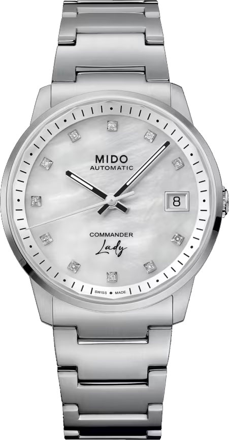 luxusné hodinky Mido Commander Lady Diamanty, Automat, 35 mm. Hodinky disponujú funkciami luminiscencia a ukazovateľ dátumu. Základné parametre hodín sú: typ strojčeka je mechanické hodinky s automatickým náťahom, materiál remienka je oceľ, vode odolnosť je 50 m a farba ciferníka je perleť.