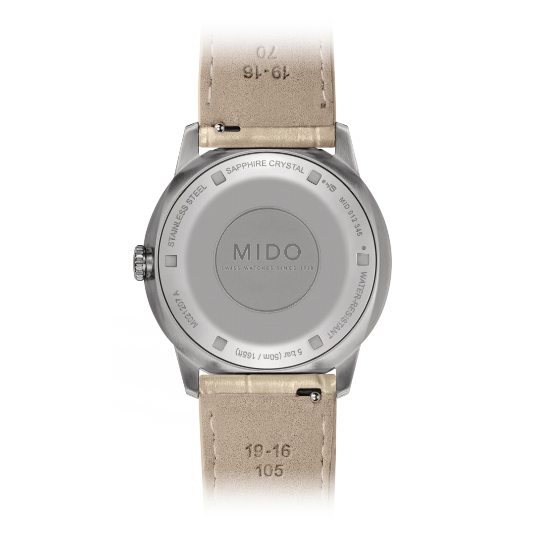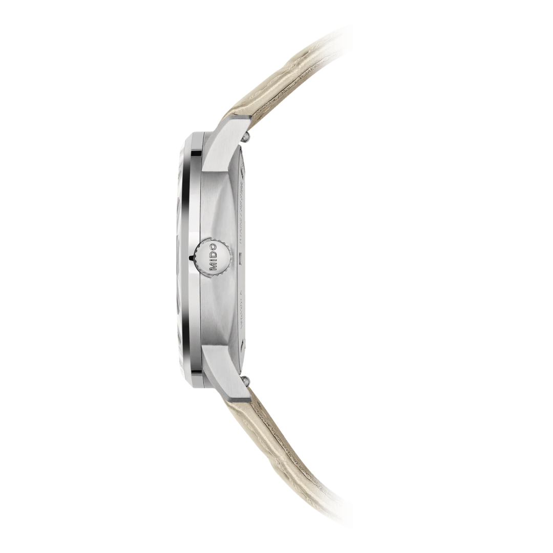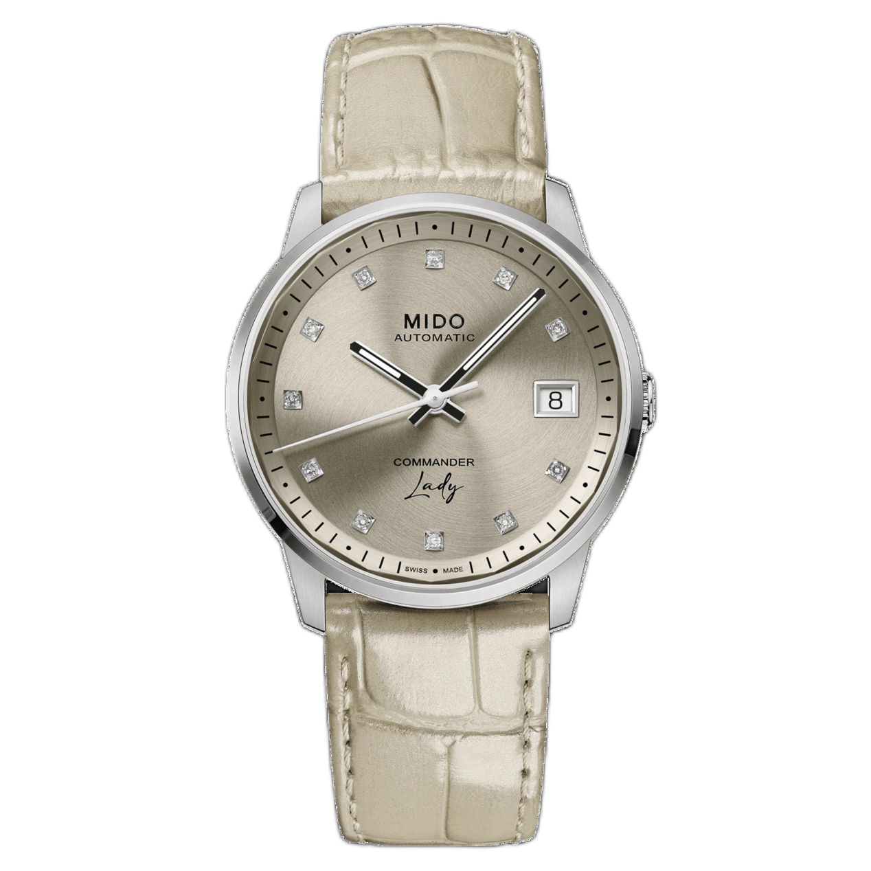 luxusné hodinky Mido Commander Lady Diamanty, Automat, 35 mm. Hodinky disponujú funkciami luminiscencia a ukazovateľ dátumu. Základné parametre hodín sú: farba ciferníka je béžová, typ strojčeka je mechanické hodinky s automatickým náťahom, materiál remienka je koža a vode odolnosť je 50 m.