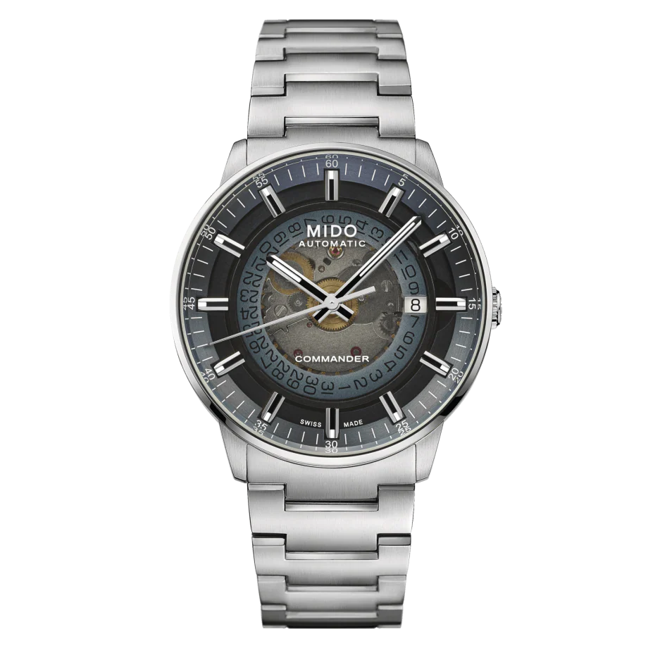 luxusné hodinky Mido Commander Gradient Automat, Skeleton, 40 mm. Hodinky disponujú funkciami luminiscencia a ukazovateľ dátumu. Základné parametre hodín sú: farba ciferníka je priehľadná a modrá, typ strojčeka je mechanické hodinky s automatickým náťahom, vode odolnosť je 50 m a materiál remienka je oceľ.
