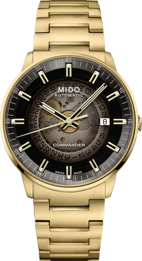 luxusné hodinky Mido Commander Gradient + Naťahovač SAPHIR len za 1 EUR Automat, Skeleton, 40 mm. Hodinky disponujú funkciami luminiscencia a ukazovateľ dátumu. Základné parametre hodín sú: farba ciferníka je priehľadná a čierna, typ strojčeka je mechanické hodinky s automatickým náťahom, vode odolnosť je 50 m a materiál remienka je oceľ.
