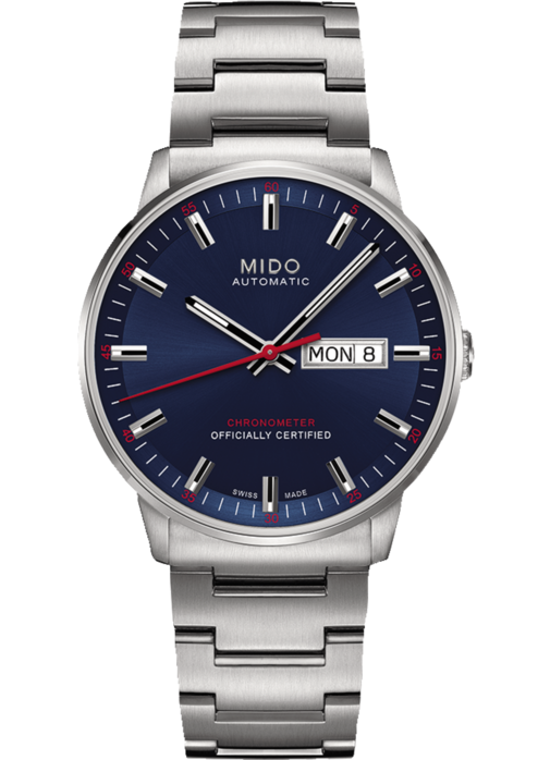 Luxusné hodinky Mido Commander Chronometer Automat, Chronometer, 40 mm. Hodinky disponujú funkciami ukazovateľ dátumu a luminiscencia. Základné parametre hodín sú: typ strojčeka je mechanické hodinky s automatickým náťahom, vode odolnosť je 50 m, farba ciferníka je modrá a materiál remienka je oceľ.