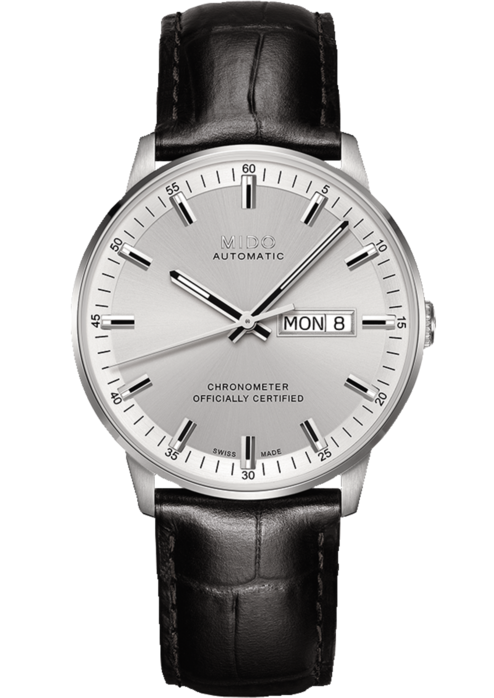 Luxusné hodinky Mido Commander Chronometer Automat, Chronometer, 40 mm. Hodinky disponujú funkciami ukazovateľ dátumu a luminiscencia. Základné parametre hodín sú: typ strojčeka je mechanické hodinky s automatickým náťahom, vode odolnosť je 50 m, materiál remienka je koža a farba ciferníka je strieborná.