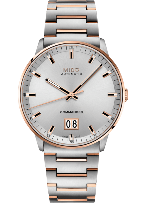 Luxusné hodinky Mido Commander Big Date Automat, 42 mm. Hodinky disponujú funkciami ukazovateľ dátumu a luminiscencia. Základné parametre hodín sú: farba ciferníka je strieborná, typ strojčeka je mechanické hodinky s automatickým náťahom, materiál remienka je oceľ a vode odolnosť je 50 m.