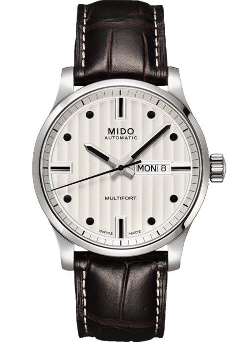 Luxusné hodinky Mido Multifort Gent Automat, Vode odolnosť 100M, 42 mm. Hodinky disponujú funkciami luminiscencia, ukazovateľ dátumu a Day-Date. Základné parametre hodín sú: farba ciferníka je strieborná, typ strojčeka je mechanické hodinky s automatickým náťahom, materiál remienka je koža a vode odolnosť je 100 m.