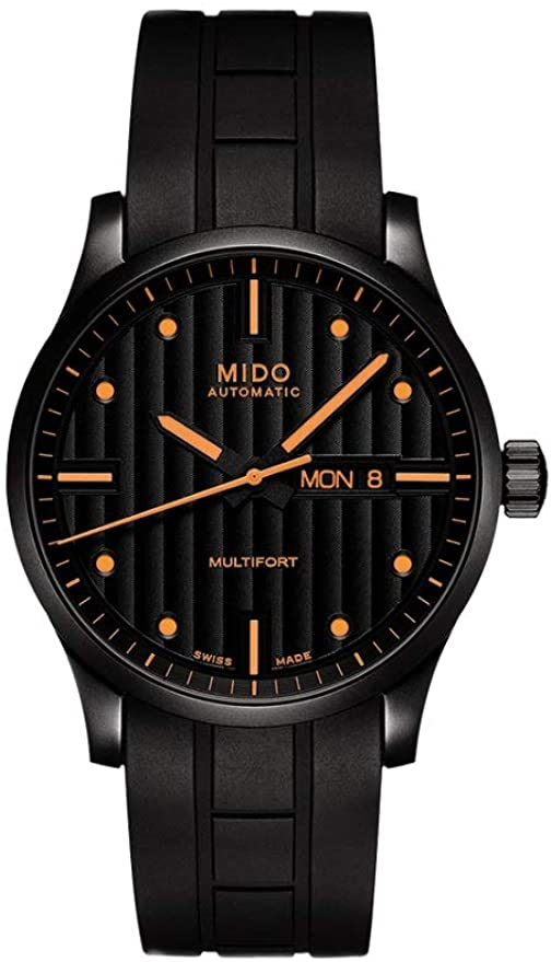 Luxusné hodinky Mido Multifort Automat, Vode odolnosť 100M, 42 mm. Hodinky disponujú funkciami luminiscencia, tréningové funkcie a Day-Date. Základné parametre hodín sú: farba ciferníka je čierna, typ strojčeka je mechanické hodinky s automatickým náťahom, materiál remienka je kaučuk a vode odolnosť je 100 m.