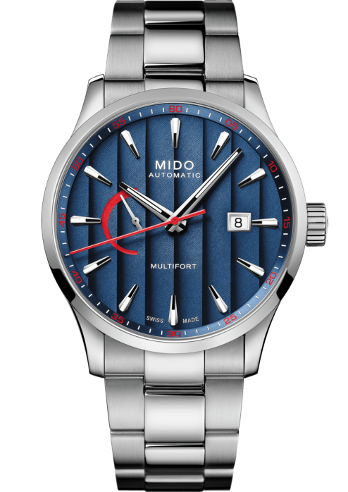 Luxusné hodinky Mido Multifort Automat, Vode odolnosť 100M, 42 mm. Hodinky disponujú funkciami luminiscencia, ukazovateľ dátumu a rezerva chodu. Základné parametre hodín sú: farba ciferníka je modrá, typ strojčeka je mechanické hodinky s automatickým náťahom, materiál remienka je oceľ a vode odolnosť je 100 m.