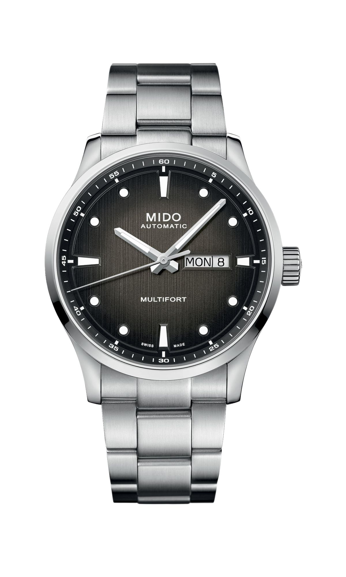luxusné hodinky Mido Multifort M Automat, 42 mm. Hodinky disponujú funkciami ukazovateľ dátumu, Day-Date a luminiscencia. Základné parametre hodín sú: typ strojčeka je mechanické hodinky s automatickým náťahom a chronometer, vode odolnosť je 100 m, materiál remienka je oceľ a farba ciferníka je čierna.
