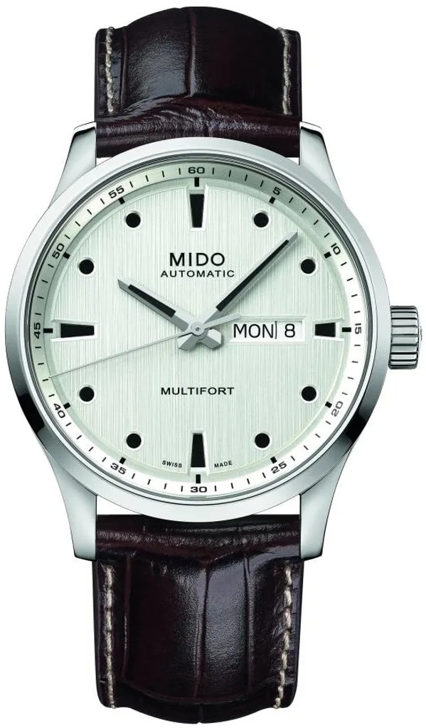 luxusné hodinky Mido Multifort M Automat, 42 mm. Hodinky disponujú funkciami ukazovateľ dátumu, Day-Date a luminiscencia. Základné parametre hodín sú: typ strojčeka je mechanické hodinky s automatickým náťahom, vode odolnosť je 100 m, farba ciferníka je strieborná a materiál remienka je koža.
