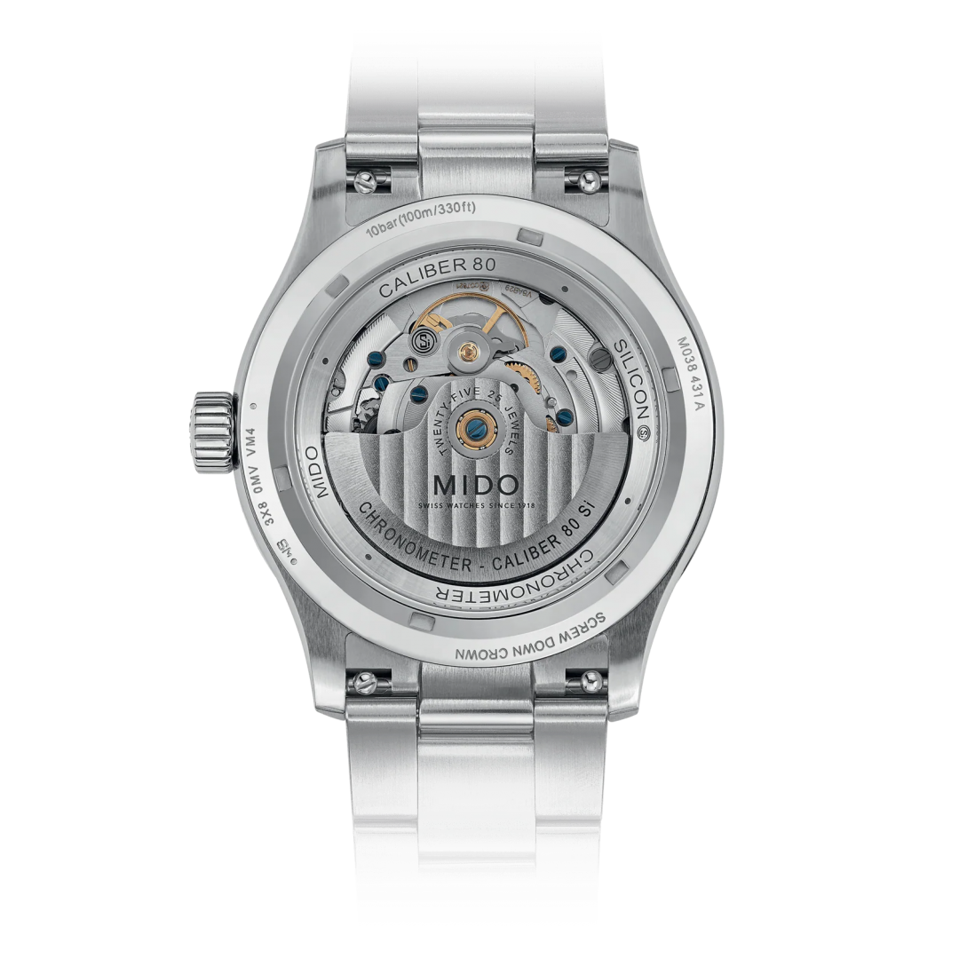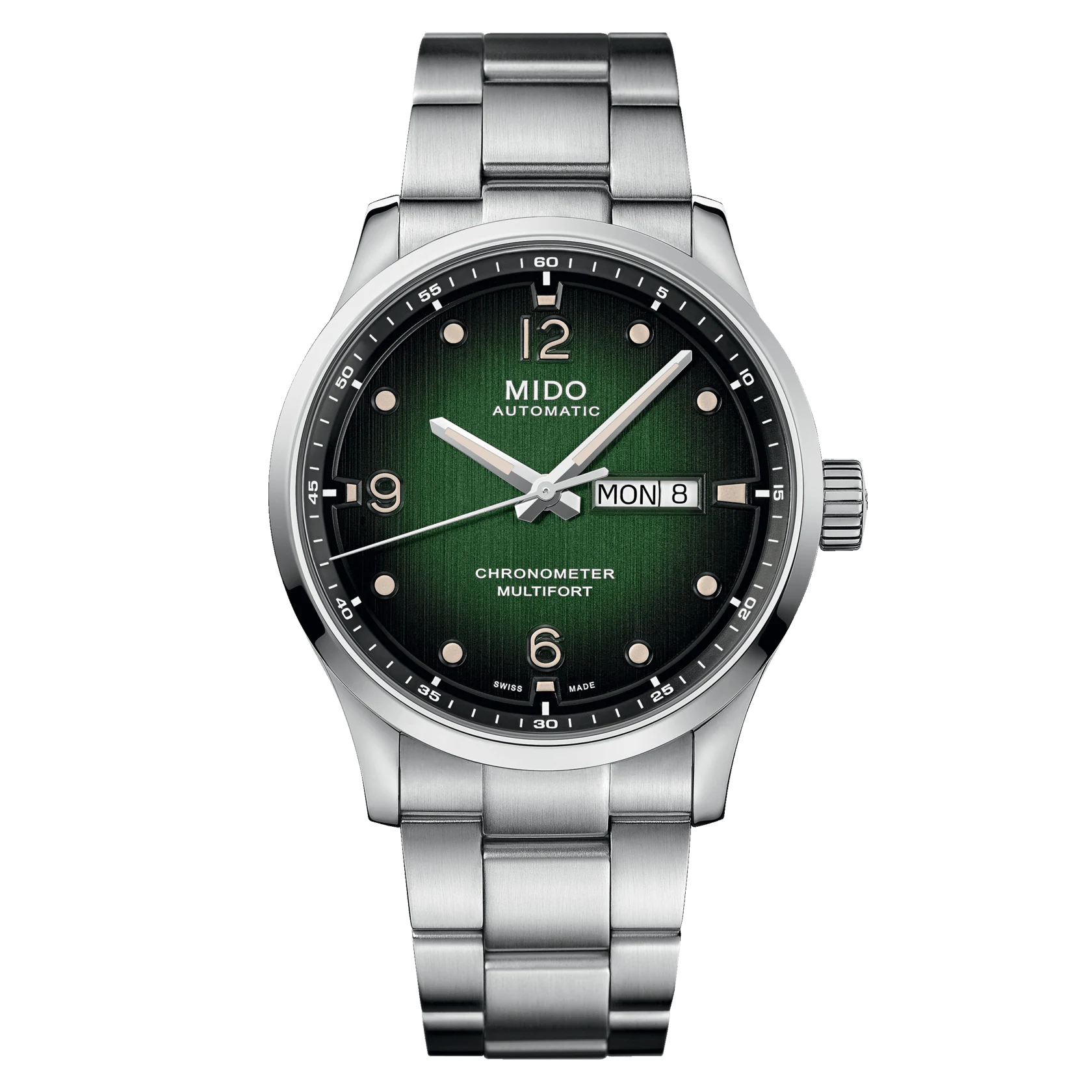 luxusné hodinky Mido Multifort M Chronometer Automat, Vode odolnosť 100M, 42 mm. Hodinky disponujú funkciami luminiscencia, ukazovateľ dátumu a Day-Date. Základné parametre hodín sú: farba ciferníka je zelená, typ strojčeka je mechanické hodinky s automatickým náťahom, materiál remienka je oceľ a vode odolnosť je 100 m.
