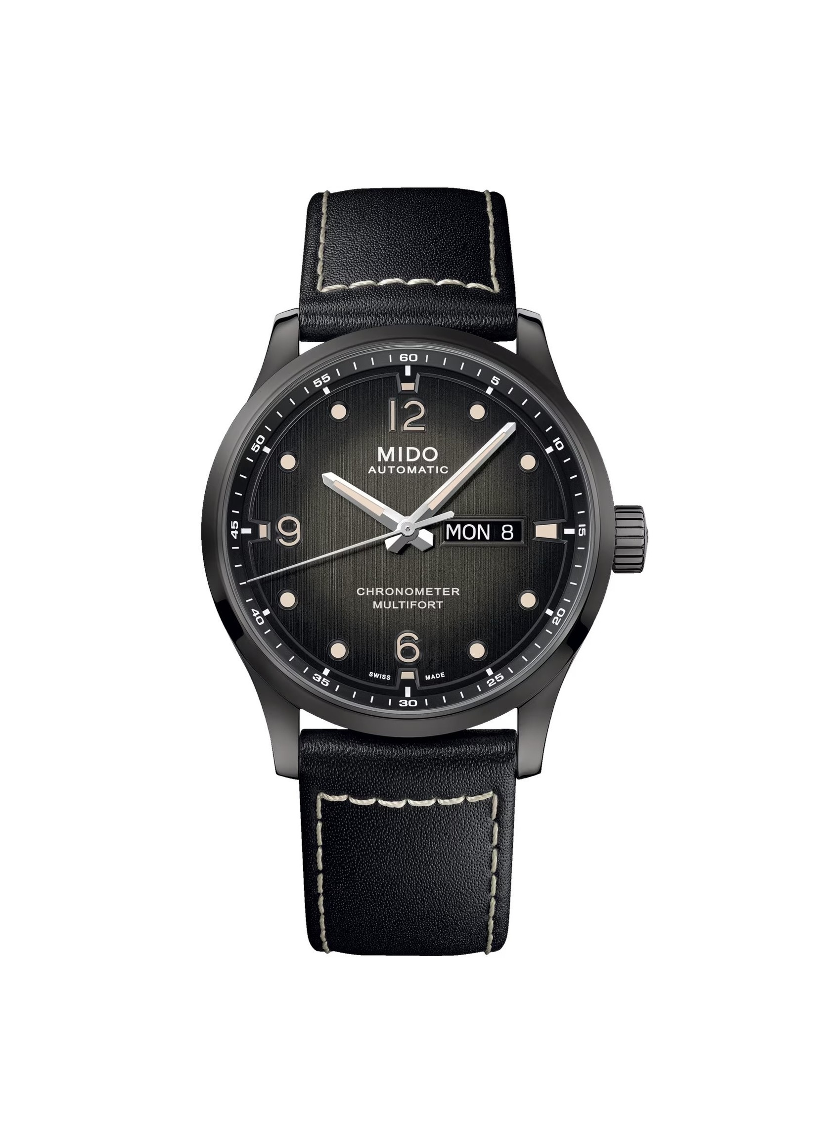 Luxusné hodinky Mido Multifort M CHRONOMETER Automat, 42 mm. Hodinky disponujú funkciami ukazovateľ dátumu, Day-Date a luminiscencia. Základné parametre hodín sú: typ strojčeka je mechanické hodinky s automatickým náťahom a chronometer, vode odolnosť je 100 m, farba ciferníka je čierna a materiál remienka je koža.