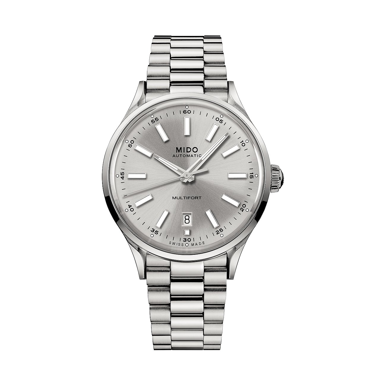 luxusné hodinky Mido Multifort Patrimony Powerwind Automat, 40 mm. Hodinky disponujú funkciami luminiscencia a ukazovateľ dátumu. Základné parametre hodín sú: farba ciferníka je strieborná, typ strojčeka je mechanické hodinky s automatickým náťahom, materiál remienka je oceľ a vode odolnosť je 50 m.