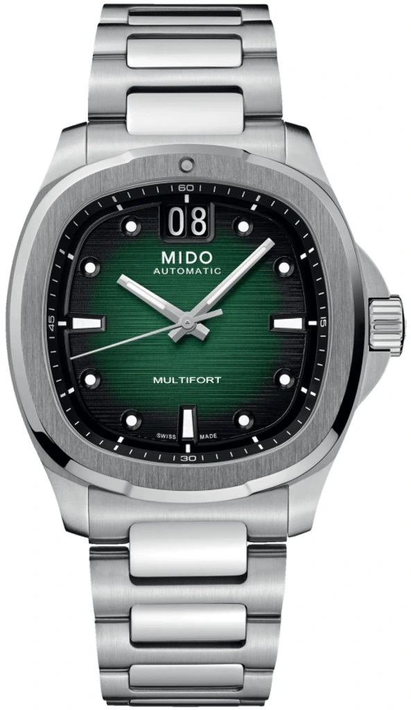luxusné hodinky Mido Multifort TV Big Date Automat, Vode odolnosť 100M, 40 mm. Hodinky disponujú funkciami luminiscencia a ukazovateľ dátumu. Základné parametre hodín sú: farba ciferníka je zelená, typ strojčeka je mechanické hodinky s automatickým náťahom, materiál remienka je oceľ a vode odolnosť je 100 m.