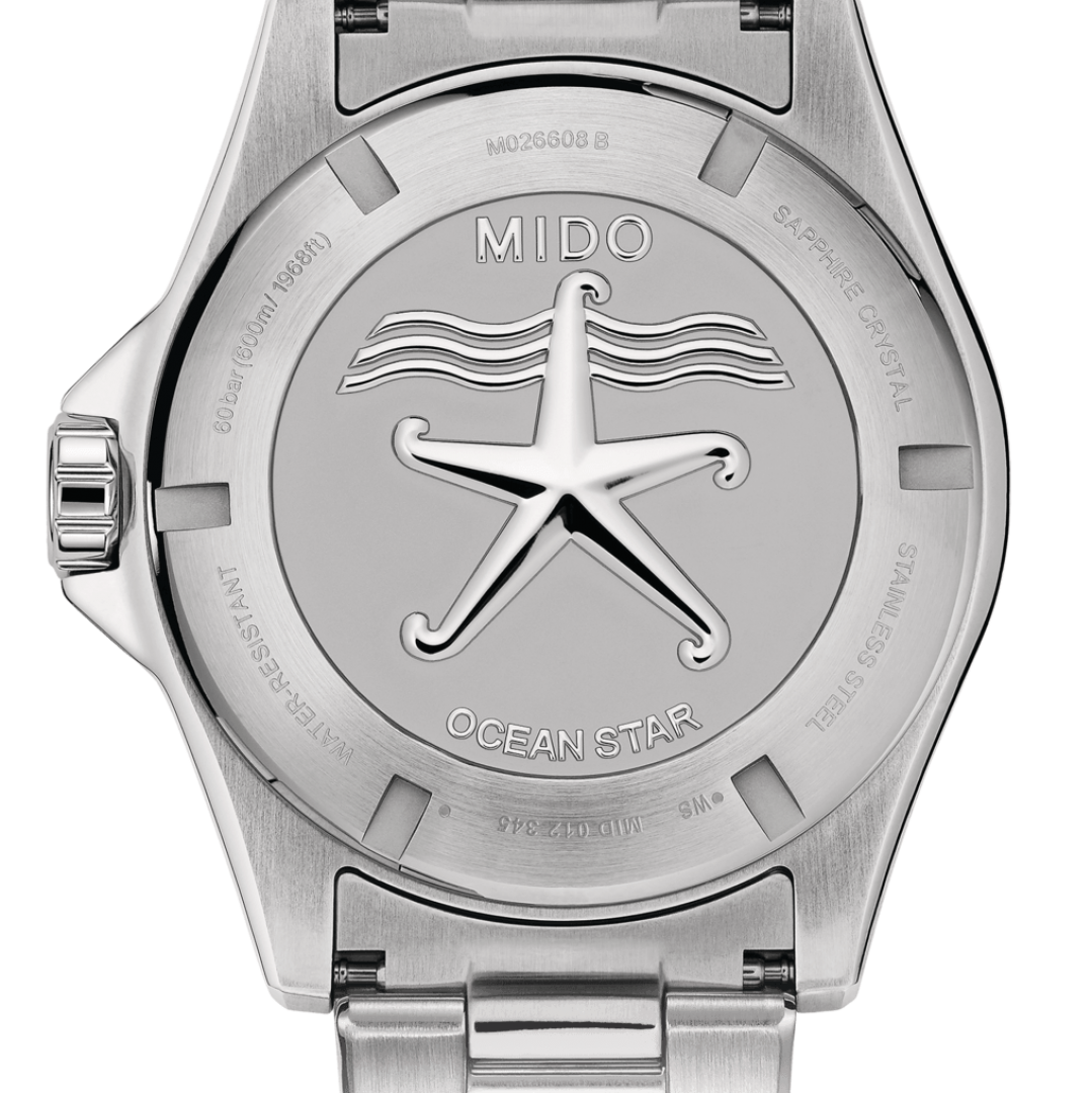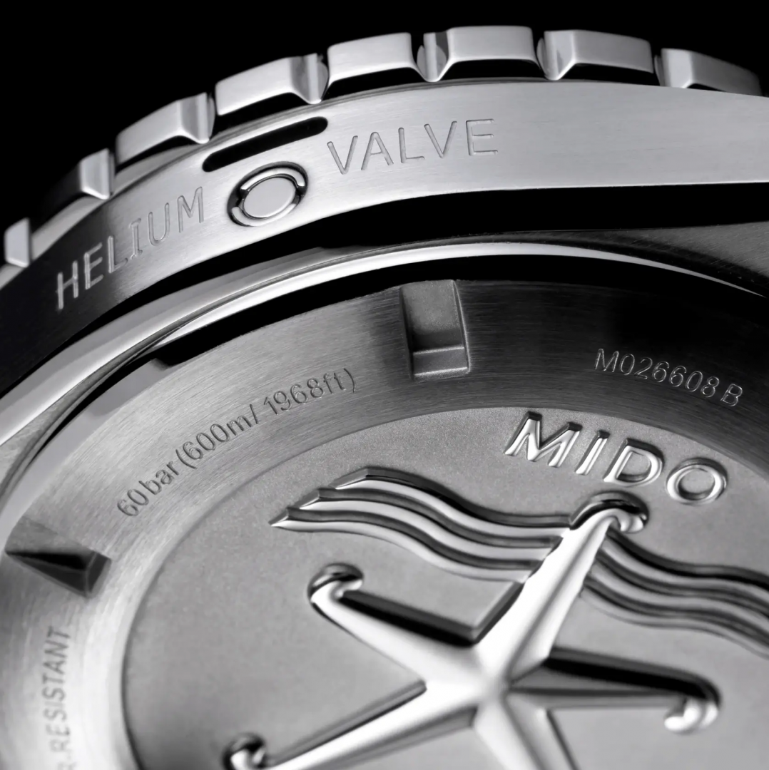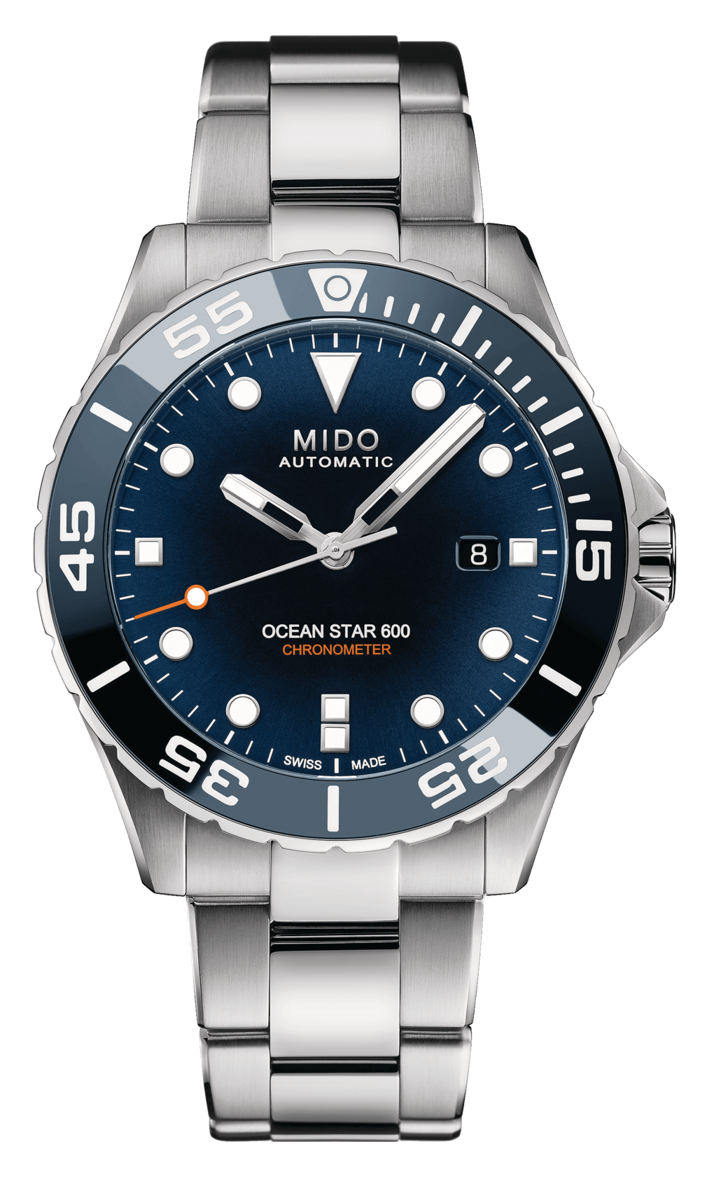 luxusné hodinky Mido Ocean Star 600 Chronometer Powermatic 80, Vode odolnosť 600M, 43.50 mm. Hodinky disponujú funkciami heliový ventil, luminiscencia a ukazovateľ dátumu. Základné parametre hodín sú: farba ciferníka je modrá, typ strojčeka je mechanické hodinky s automatickým náťahom, materiál remienka je oceľ a vode odolnosť je 600 m.