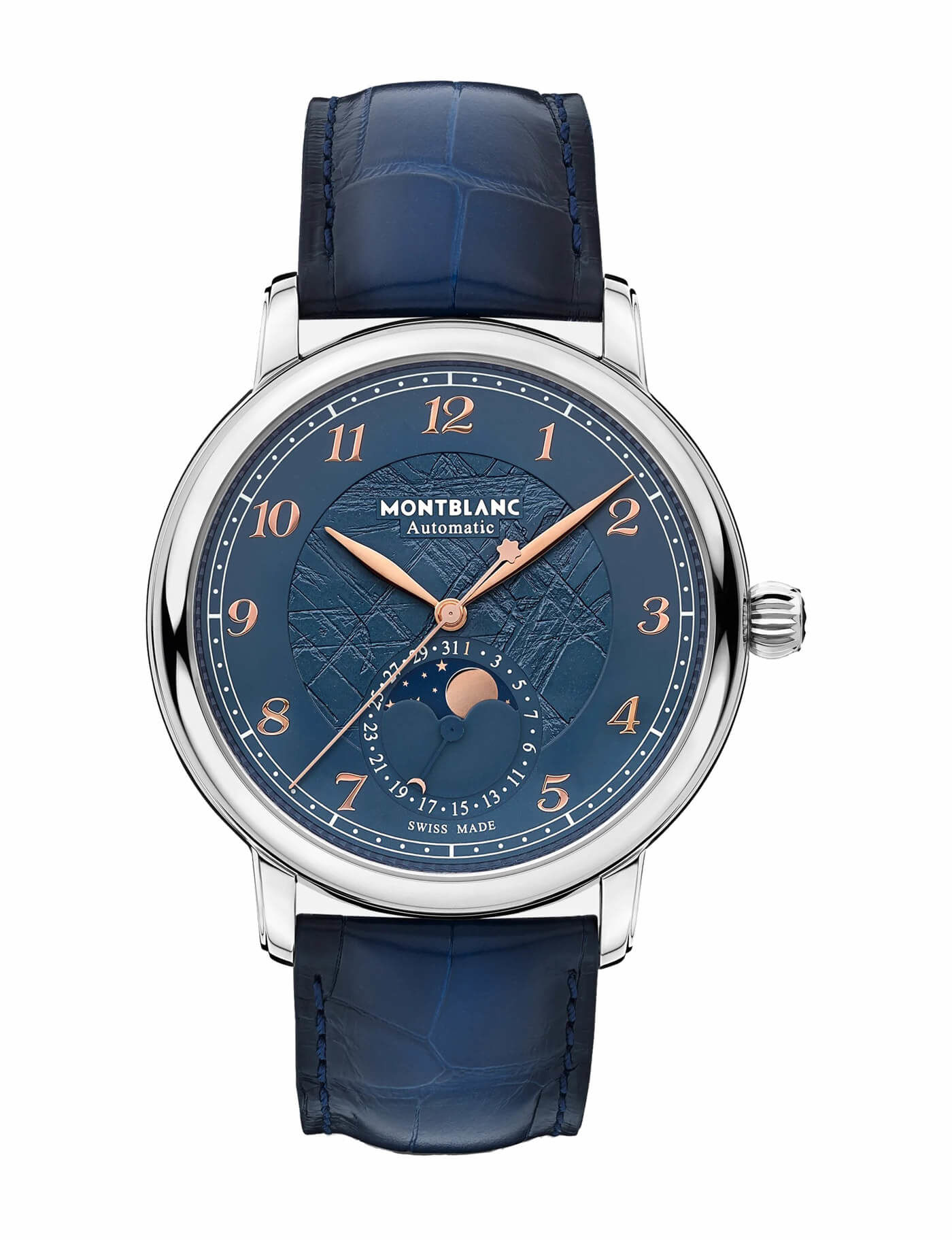 luxusné hodinky Montblanc Star Legacy Moonphase 1786 pcs. Automat, 42 mm. Hodinky disponujú funkciami mesačné fázy a ukazovateľ dátumu. Základné parametre hodín sú: farba ciferníka je modrá, typ strojčeka je mechanické hodinky s automatickým náťahom, materiál remienka je koža a vode odolnosť je 50 m.