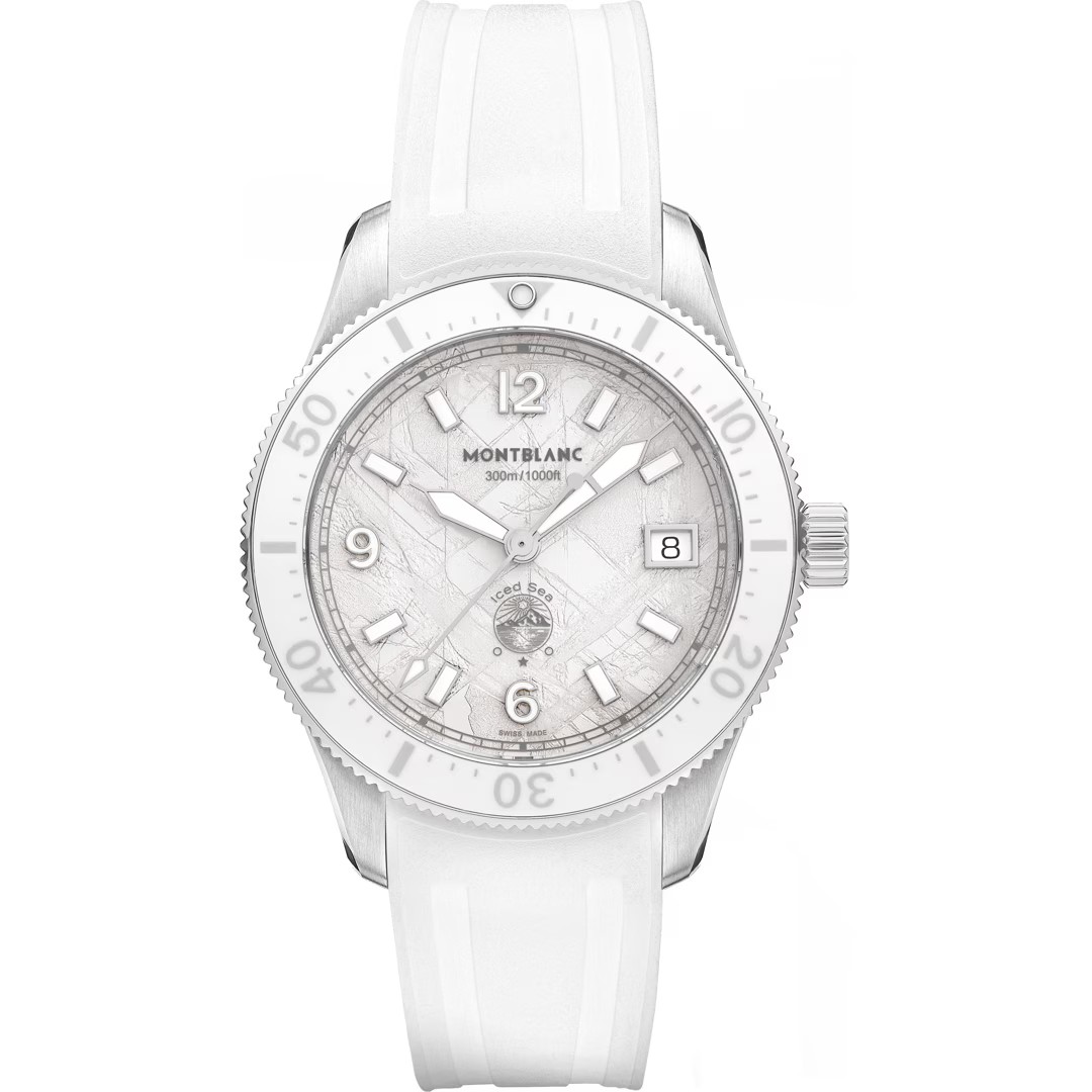 luxusné hodinky Montblanc 1858 Collection Iced Sea Automatic Date 0 Oxygen Keramická luneta, Automat, 38 mm. Hodinky disponujú funkciami luminiscencia a ukazovateľ dátumu. Základné parametre hodín sú: typ strojčeka je mechanické hodinky s automatickým náťahom, vode odolnosť je 300 m, farba ciferníka je strieborná a materiál remienka je kaučuk.