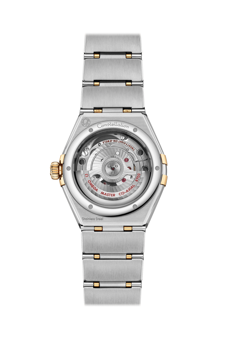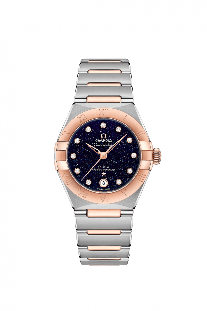 luxusné hodinky Omega Constellation Zlato & Diamanty, Automat, 29 mm. Hodinky disponujú funkciami luminiscencia. Základné parametre hodín sú: farba ciferníka je modrá, typ strojčeka je mechanické hodinky s automatickým náťahom, materiál remienka je oceľ a zlato a vode odolnosť je 50 m.