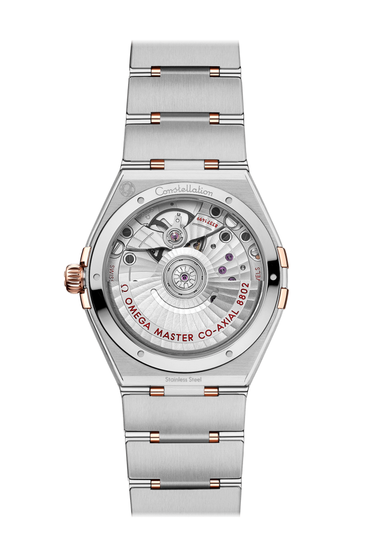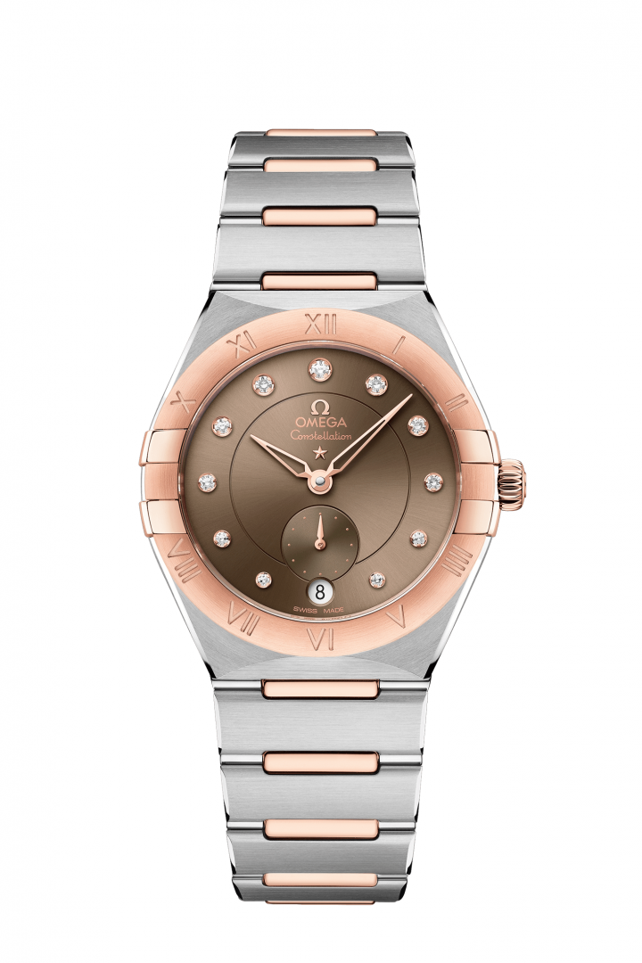 luxusné hodinky Omega Constellation Diamanty & Sedna™ Gold, Automat, 34 mm. Hodinky disponujú funkciami ukazovateľ dátumu. Základné parametre hodín sú: farba ciferníka je hnědá, typ strojčeka je mechanické hodinky s automatickým náťahom, materiál remienka je oceľ a zlato a vode odolnosť je 50 m.