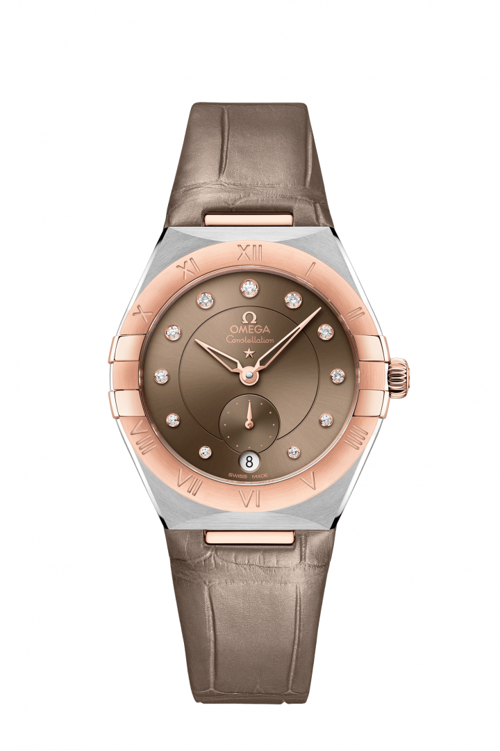 luxusné hodinky Omega Constellation Zlato & Diamanty, Automat, 34 mm. Hodinky disponujú funkciami ukazovateľ dátumu. Základné parametre hodín sú: typ strojčeka je mechanické hodinky s automatickým náťahom, vode odolnosť je 50 m, materiál remienka je koža a farba ciferníka je hnědá.